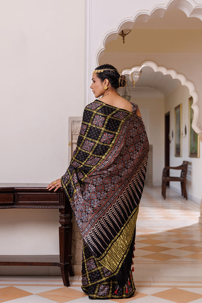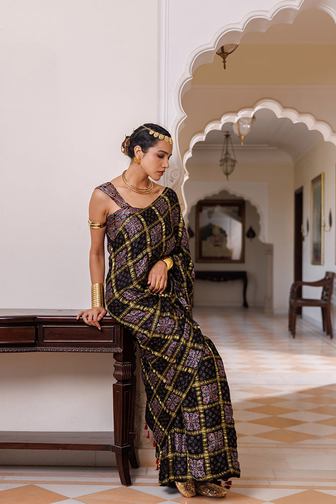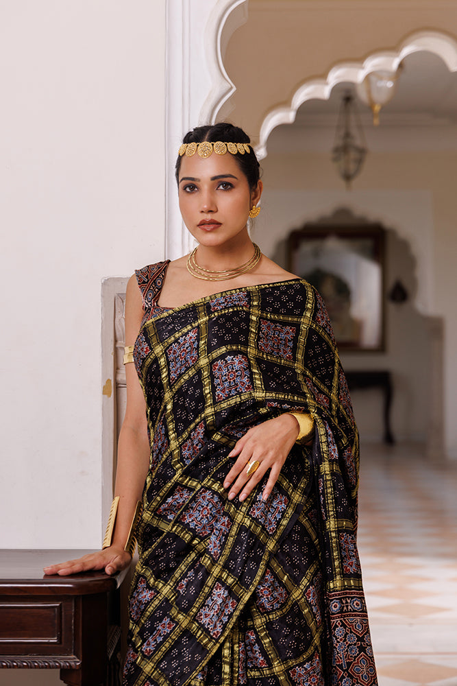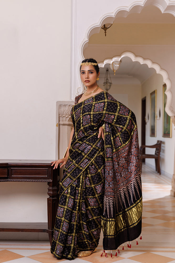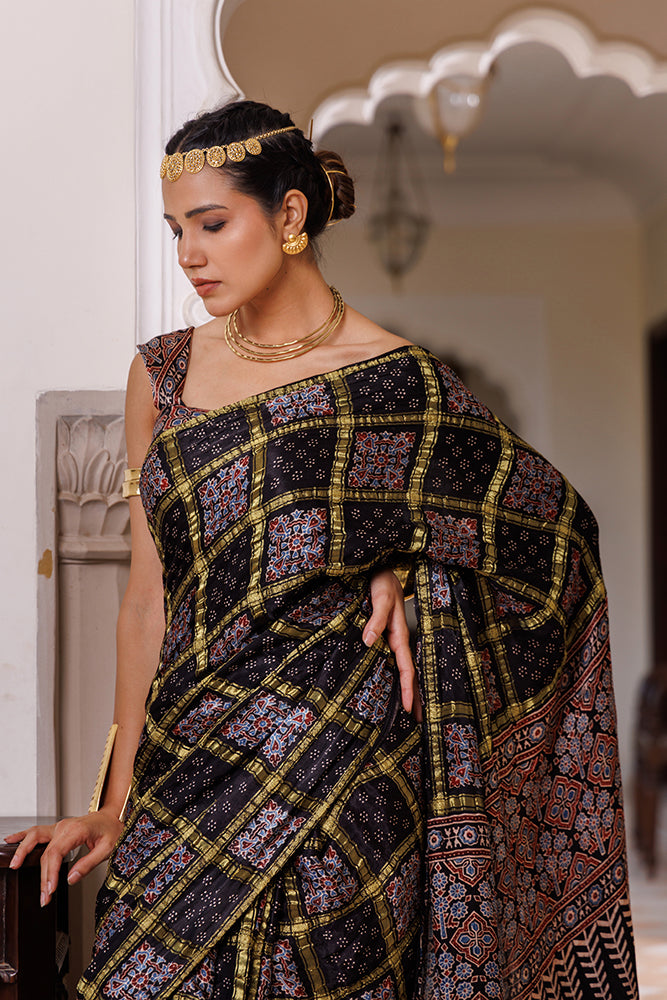 Black Ajrakh Silk Saree With Intricate Zari Check Weave