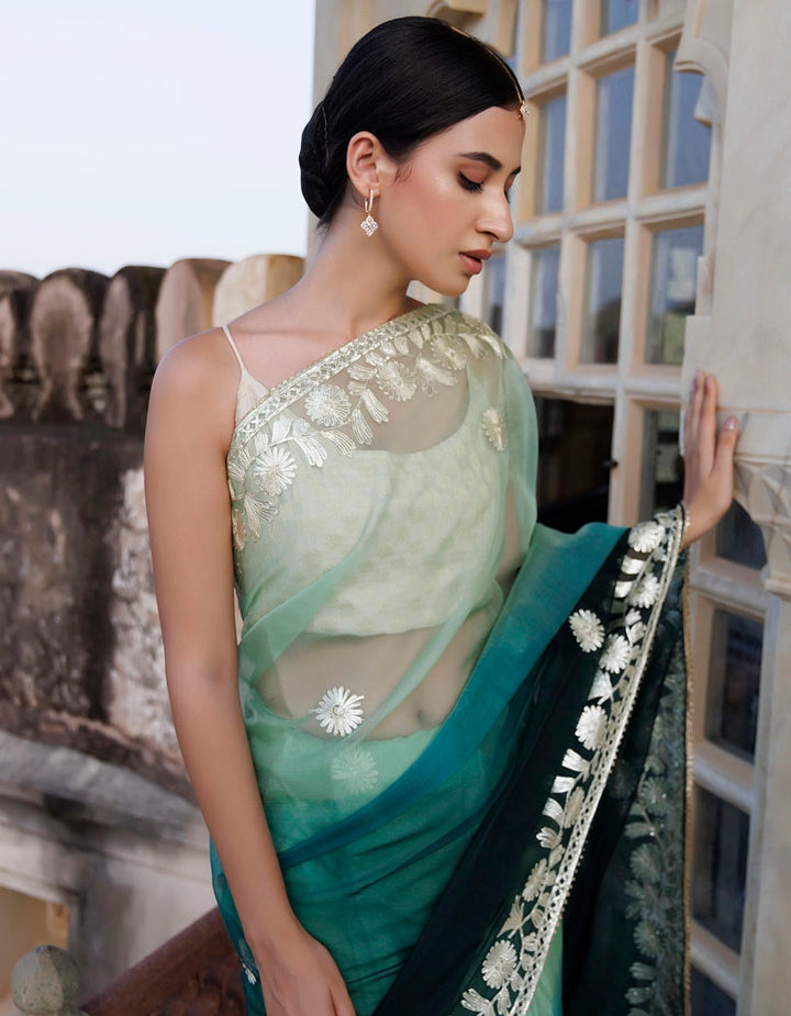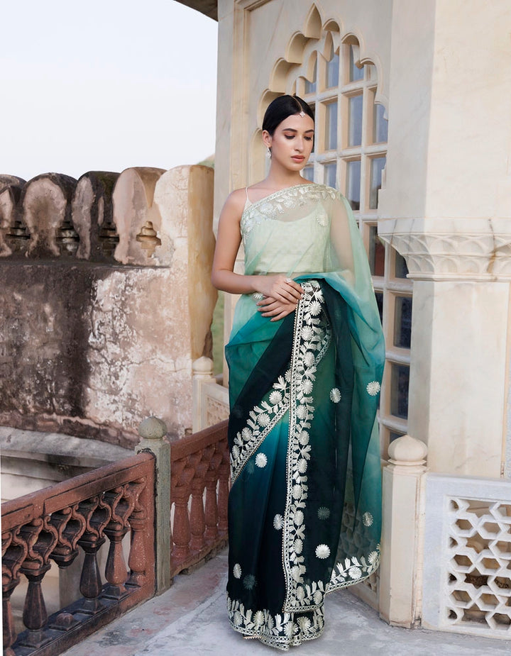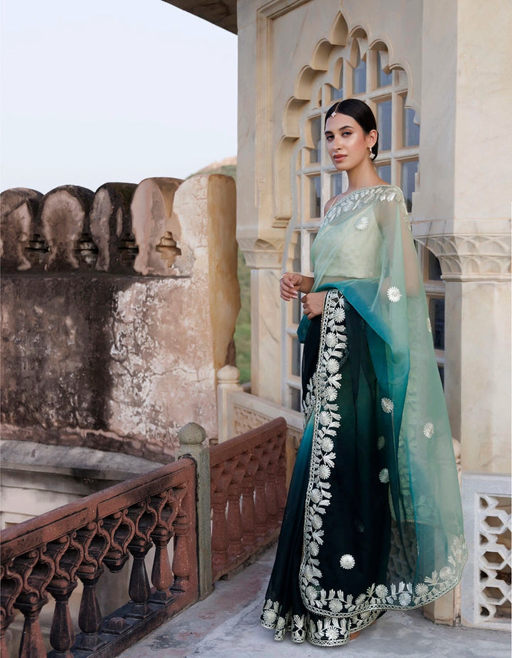 Geroo Jaipur brings an elegant Organza shaded saree to grace your festive season. The mesmerizing embroidery of gota patti transforms this saree into a wardrobe must-have whereas the attractive shades of green make it the precise choice for the festive season. It is designed with gota patti border and butas all over adorned with Beeja lace. It is paired with a matching unstitched blouse piece.
