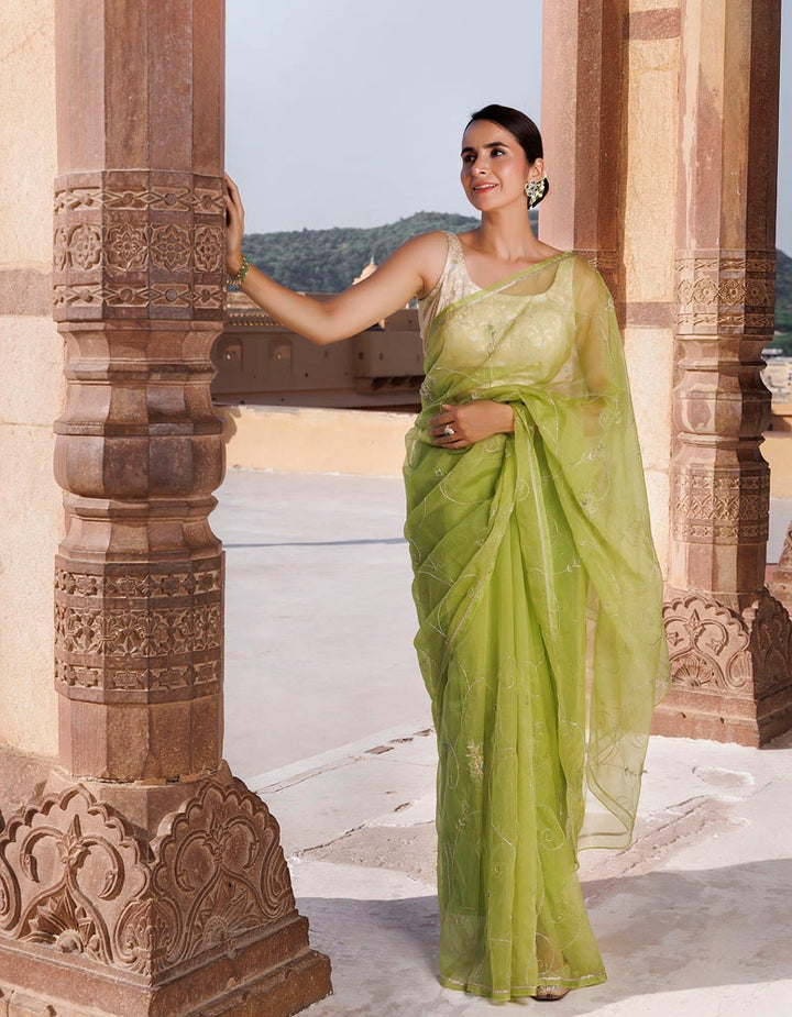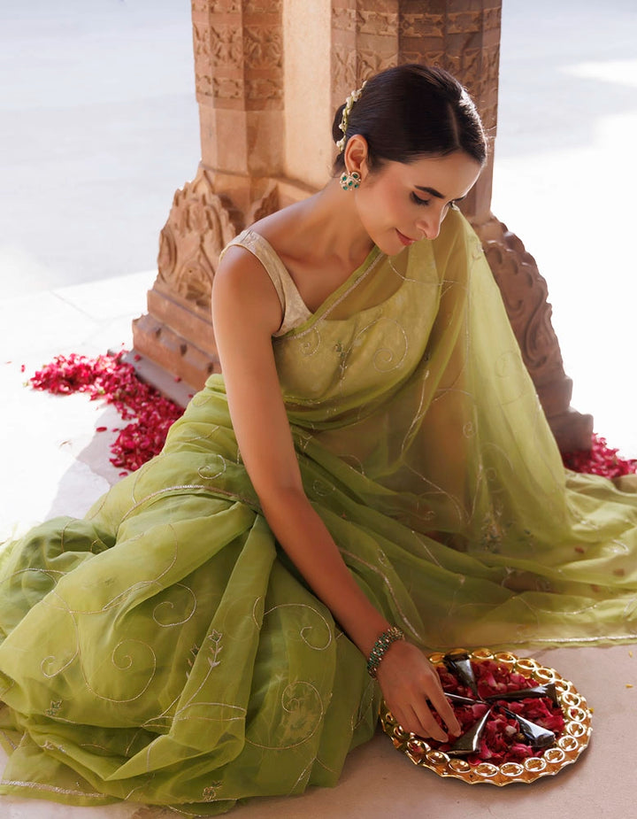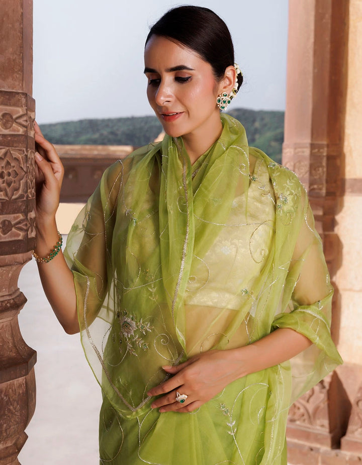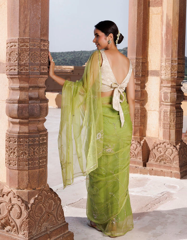 Geroo Jaipur brings an elegant Hand Embroidered Organza saree to grace your festive season. The mesmerizing handcrafting of Resham and tube work in jaal patterns transform this saree into an artistic treasure, giving timeless touch and making it a wardrobe must-have The attractive shade of green makes it the right choice for the festive season.  It is paired with a matching silk unstitched blouse piece.