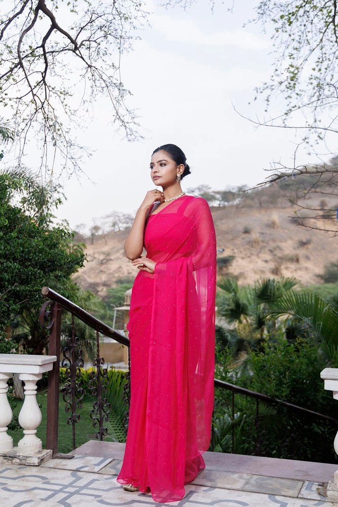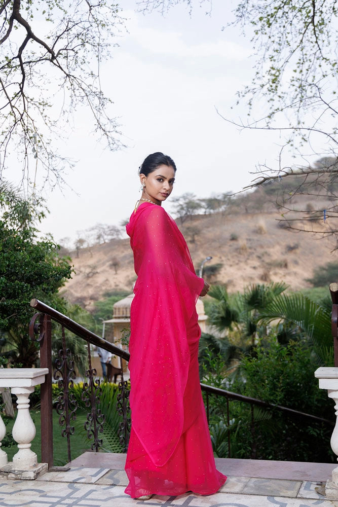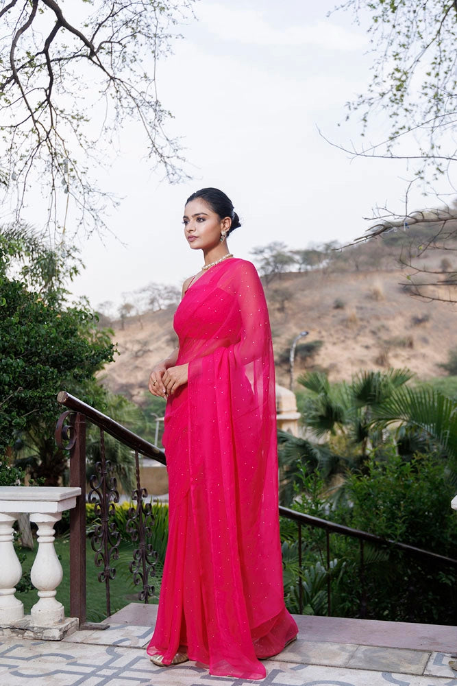 Pink Hand Embroidered Mukaish Chiffon Saree