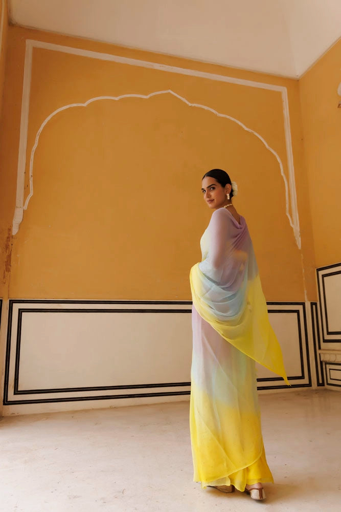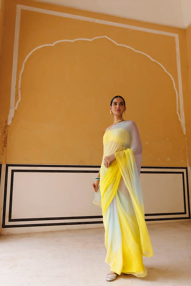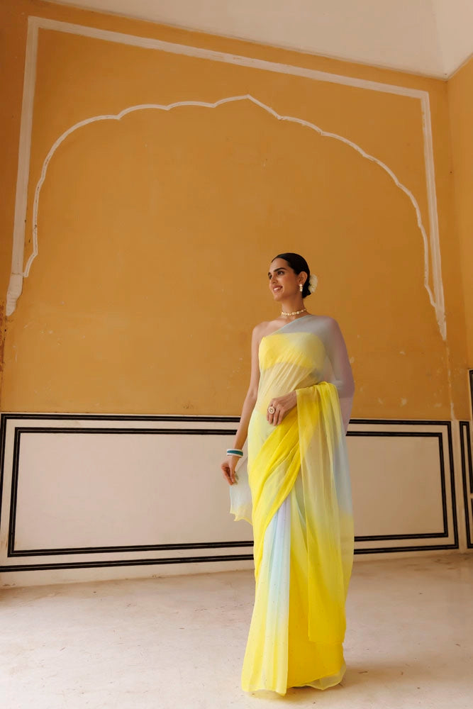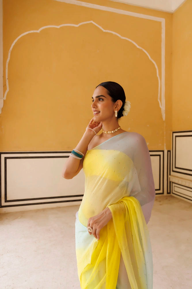 Malavika Mohanan in Yellow ShadedHand Embroidered Mukaish Chiffon Saree