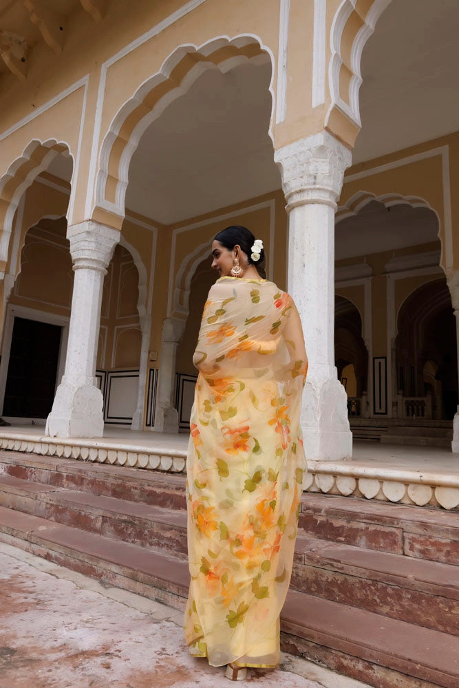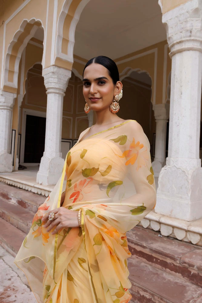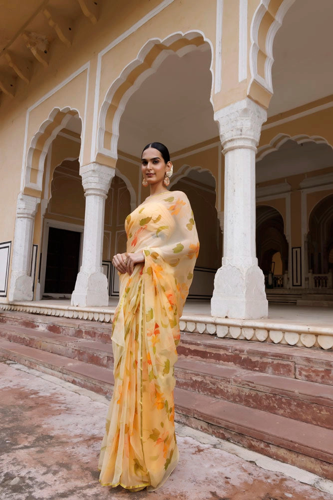 Craft: Lovingly hand-painted in Jaipur, each saree blooms with unique floral patterns, reflecting the skill and care of our artisans.