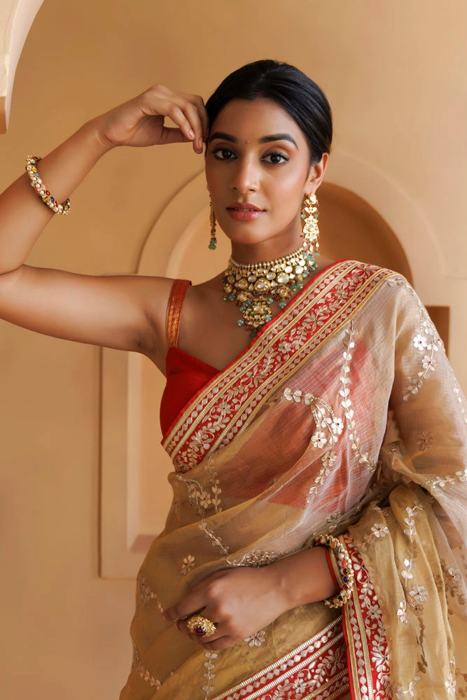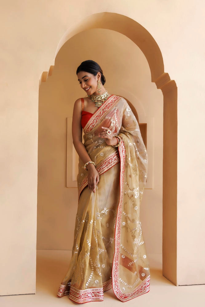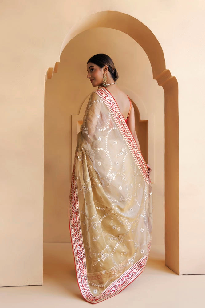 Beige Pure Kota Tissue Handcrafted Gota Patti Saree