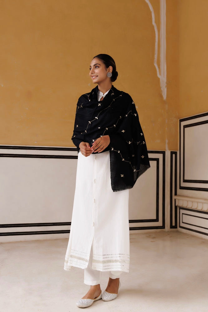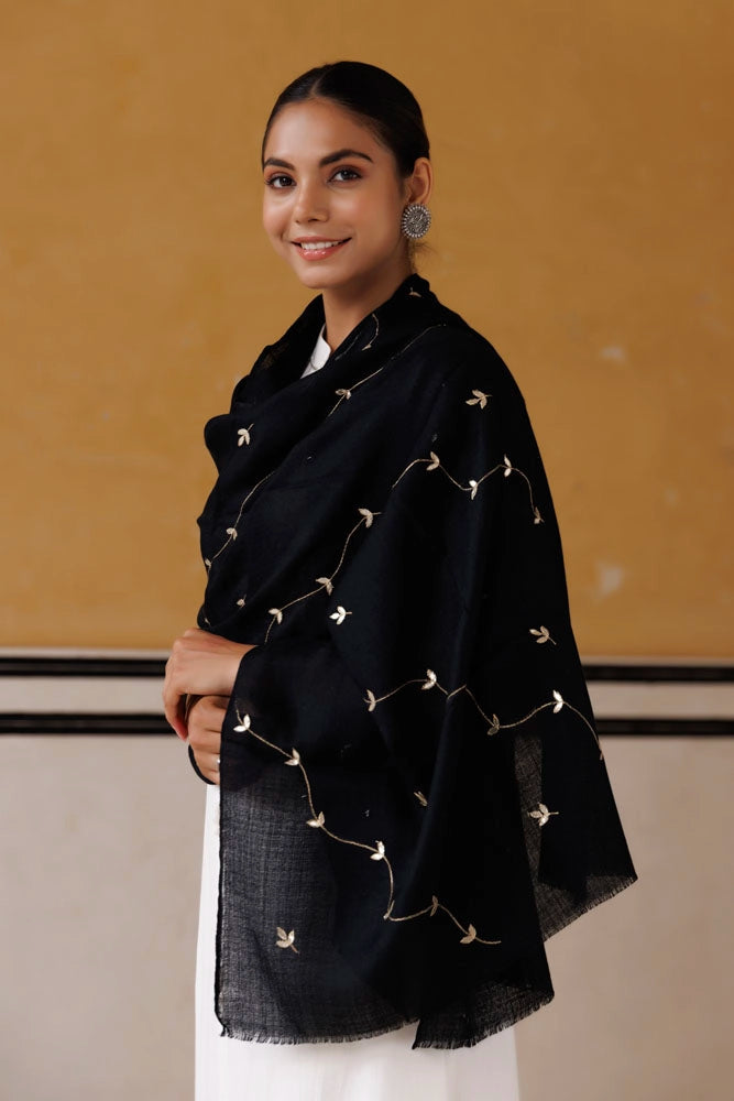 Wrap yourself in luxury with this hand-embroidered gota patti woolen shawl. It is intricately hand-crafted by skilled artists with fine embroidery of gota paati jaal. The soft texture and warmth of the shawl make it perfect for keeping you cozy and stylish.