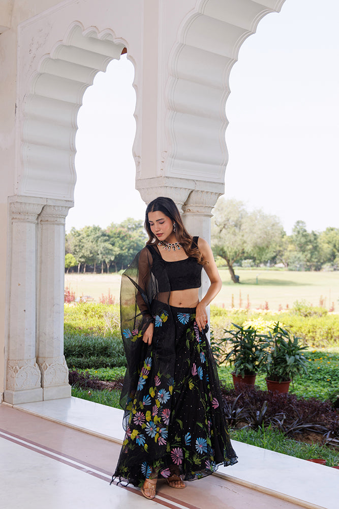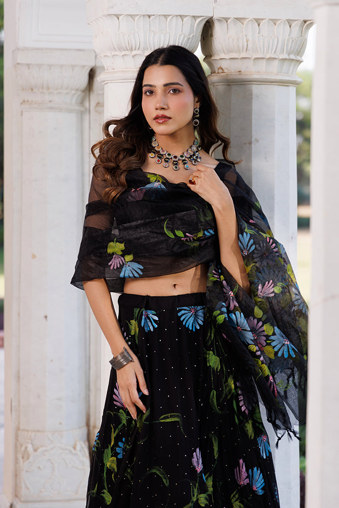 Black Hand-Painted Chiffon Lehenga With Mukaish Work & Hand Painted Organza Dupatta
