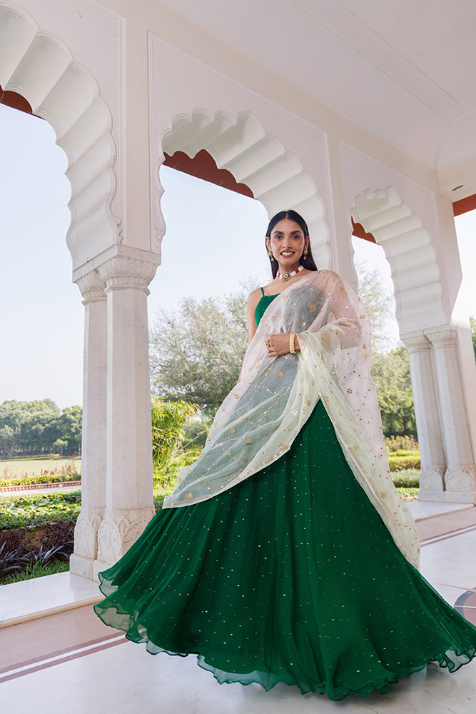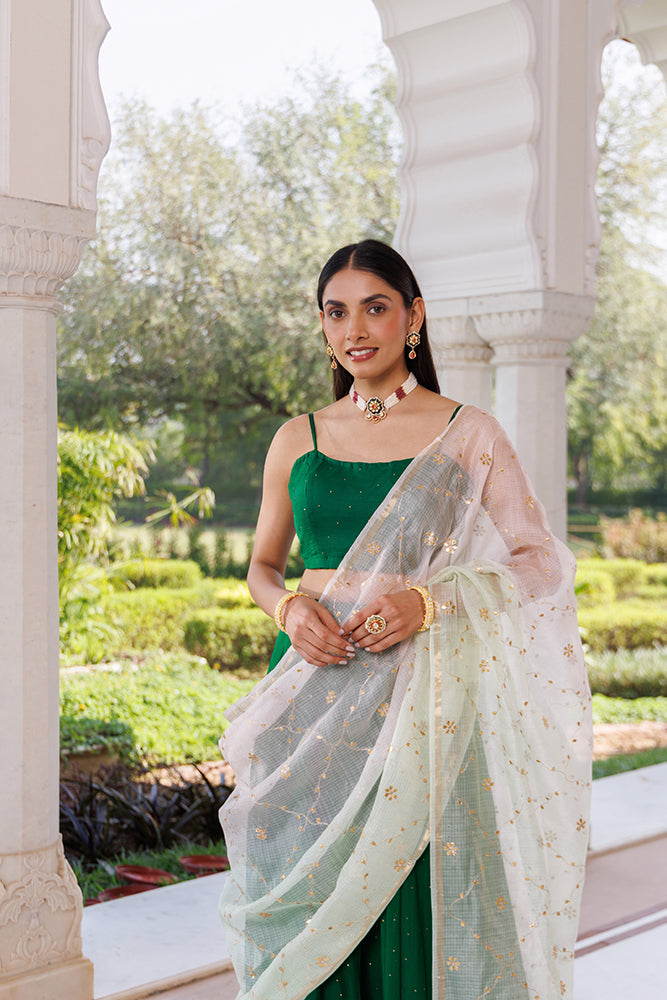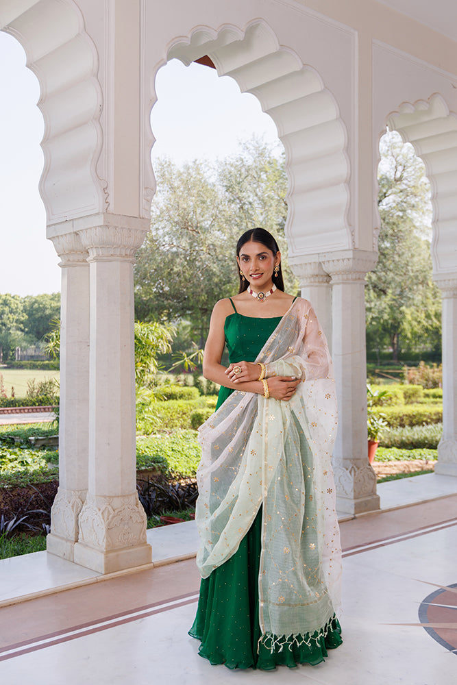 Experience sheer elegance with this green hand embellished chiffon lehenga, brought to life with delicate, shimmering Mukaish work. Paired with a hand-embroidered Kota silk dupatta adorned in fine Gota details, it blends artistry and luxury effortlessly. Comes with a soft crepe blouse piece for a flawless finish.