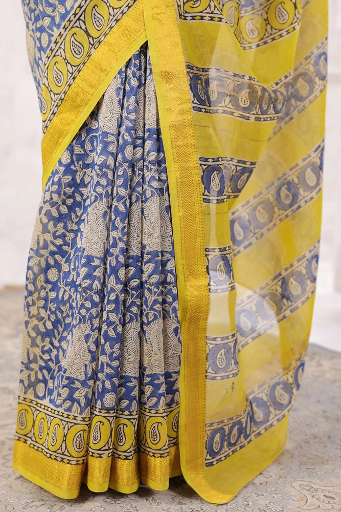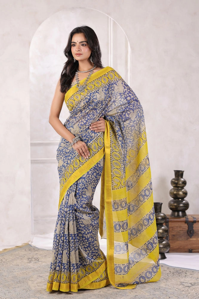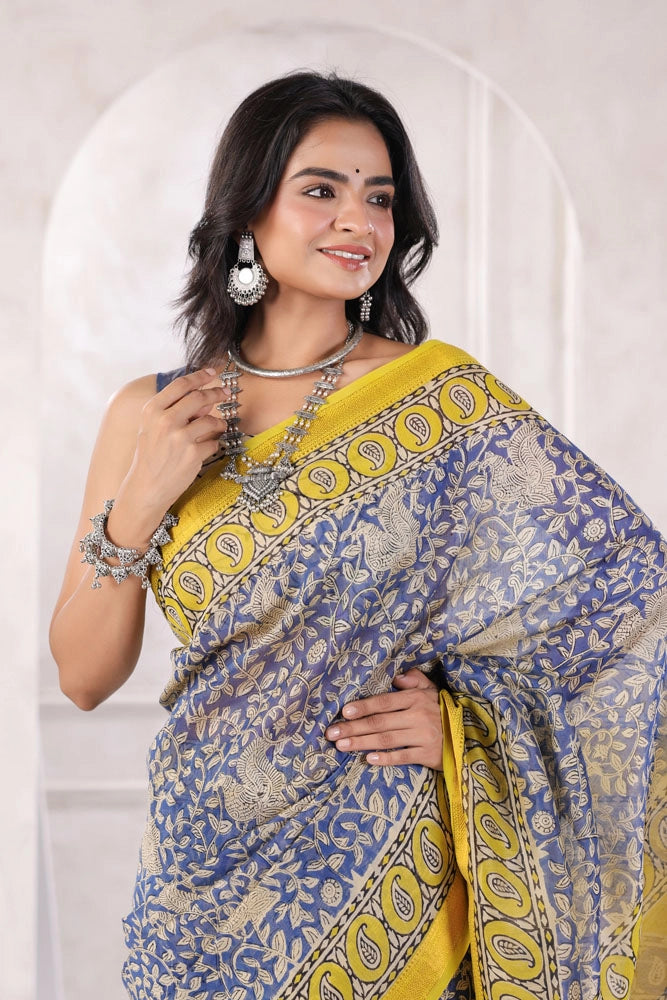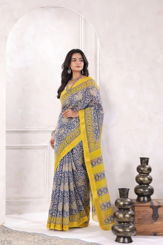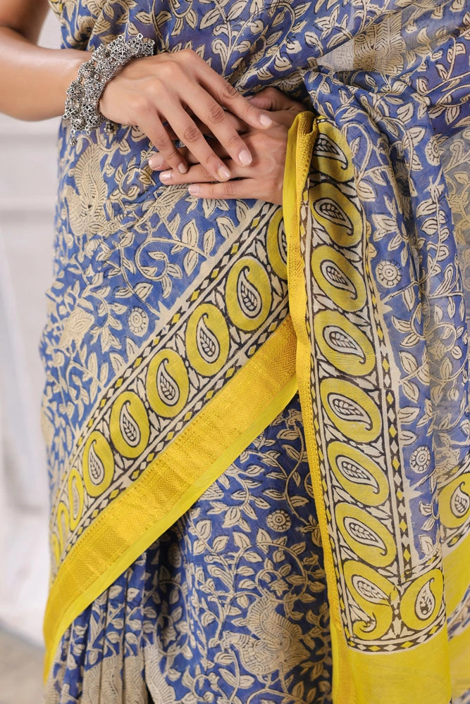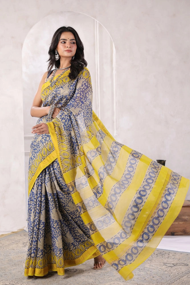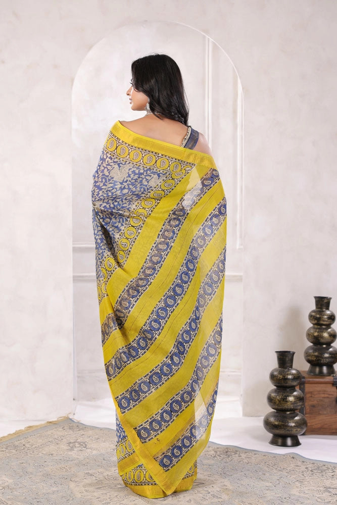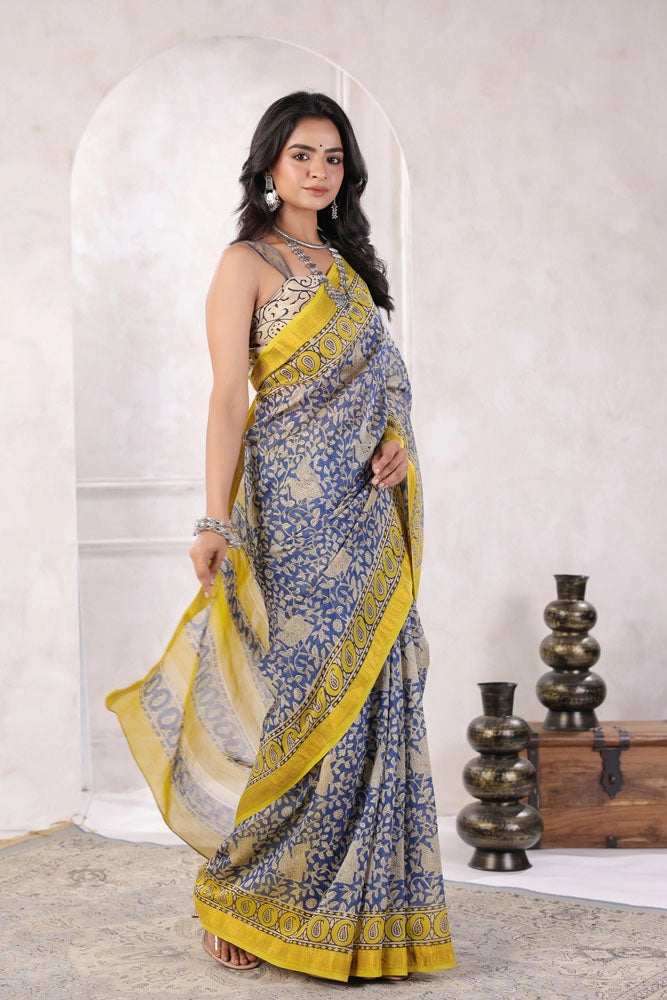 Blue Hand Block Printed Bagru Pure Chanderi Sustainable Saree