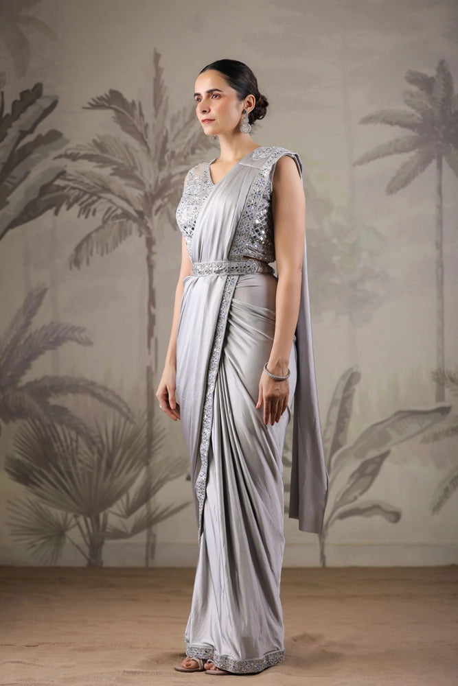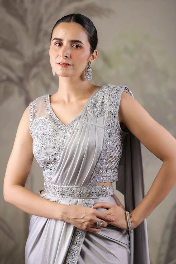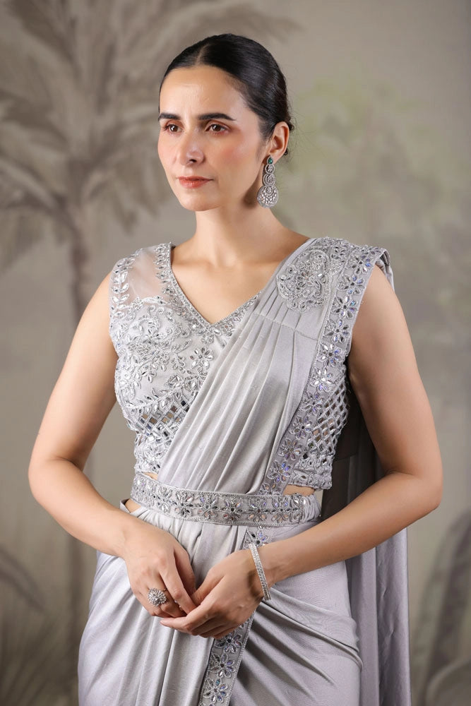 This is a grey stitched saree in satin fabric. It comes with a heavy stitched embroidered blouse.