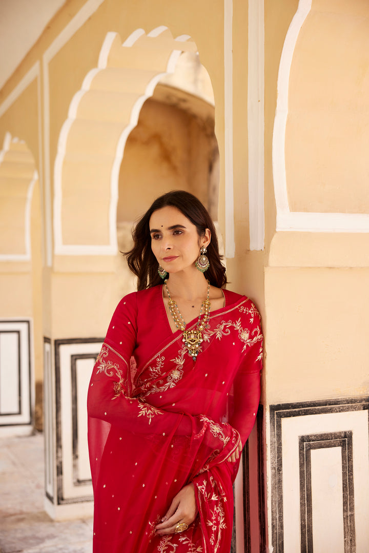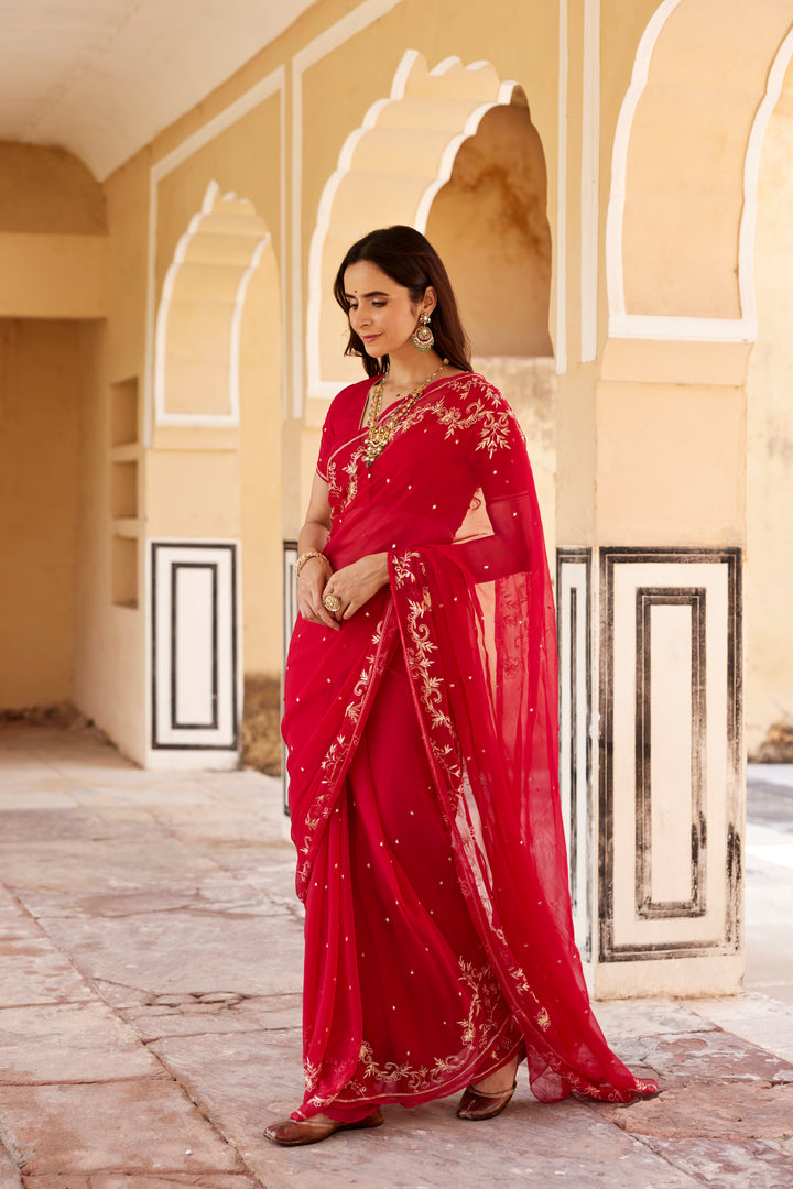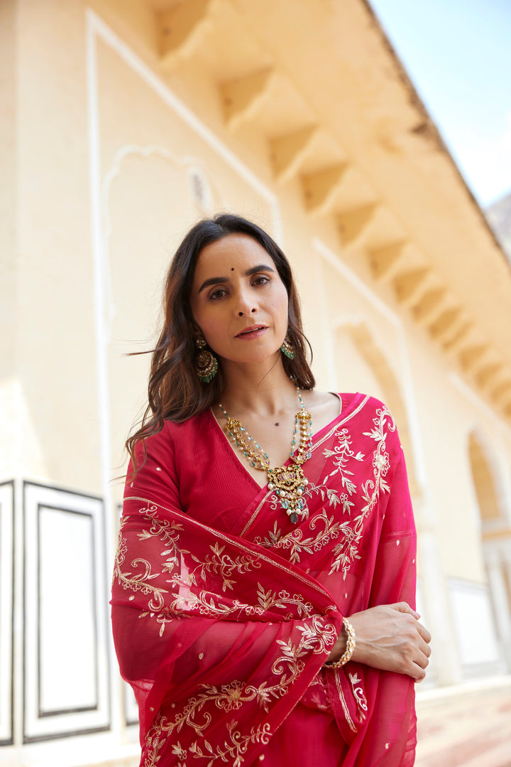 Dark Pink Hand Embroidered Aari-Zardozi Chiffon Saree