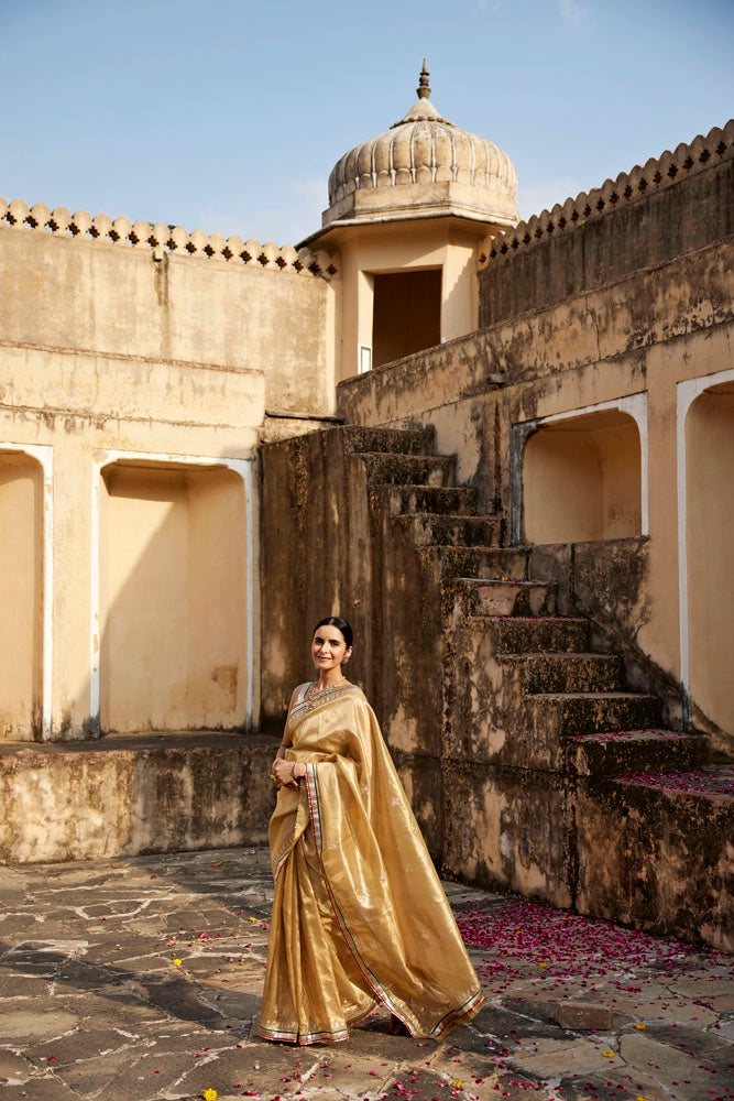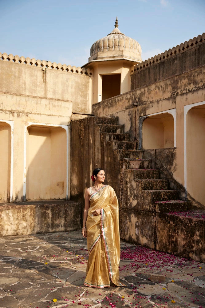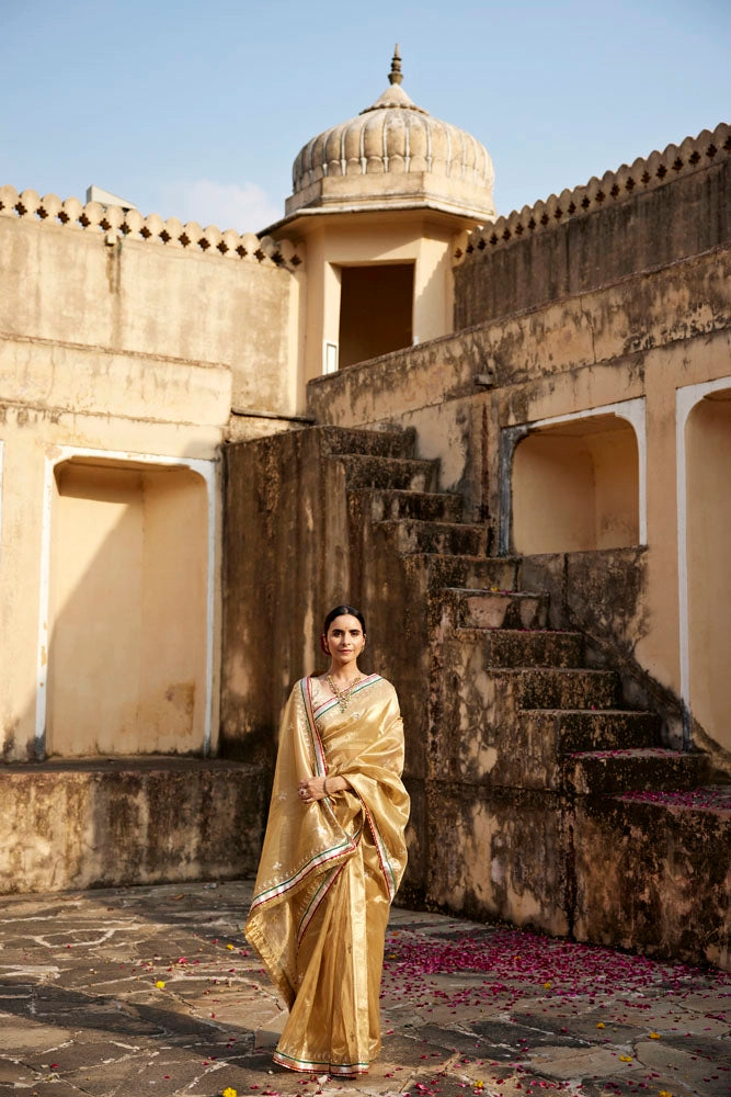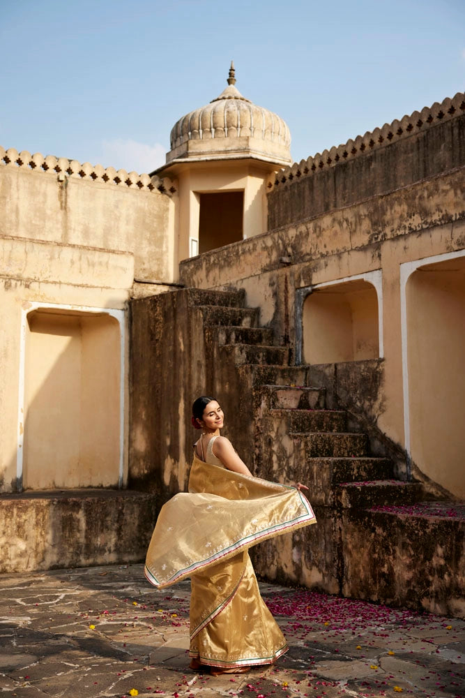 Geroo Jaipur features one of its kind prosperous drape from the house of Banaras. The saree is crafted in banarasi tissue with alluring hand-embroidered gota detailings to create majestic beauty. It is further adorned with gota lace and kirran on the pallu. The shade of gold and rich detailing make the drape an affluent, timeless classic. It is paired with a matching brocade blouse piece.