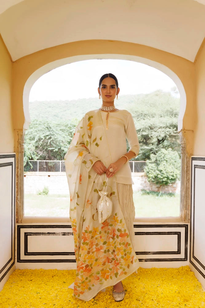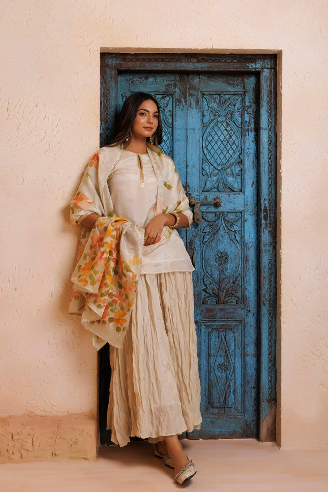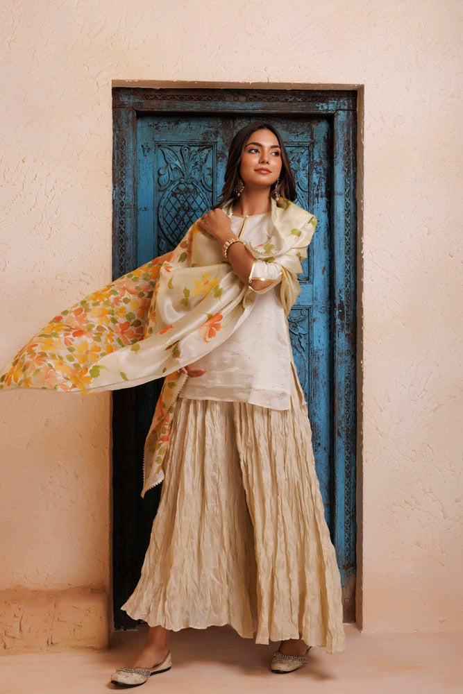 Golden Chanderi Mukaish Embroidered Garara Kurta Set with Organza Hand Painted Dupatta