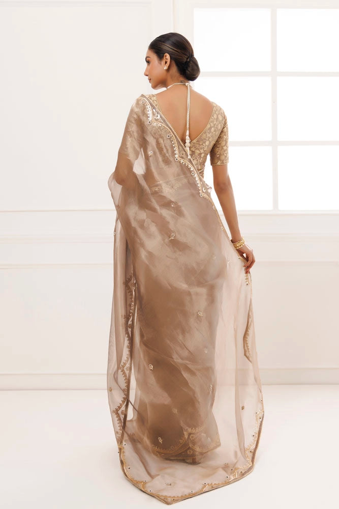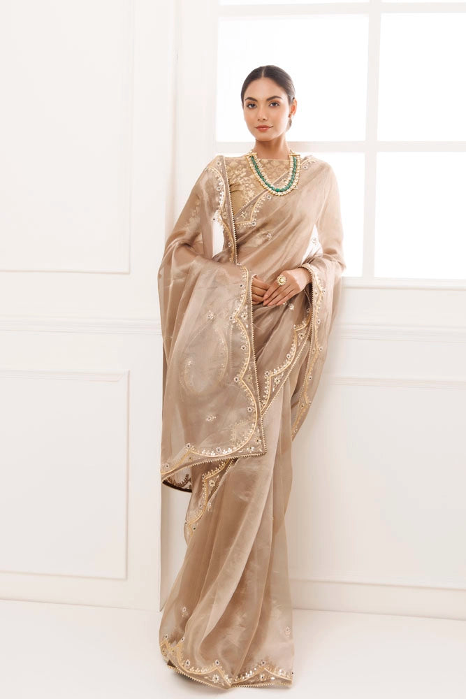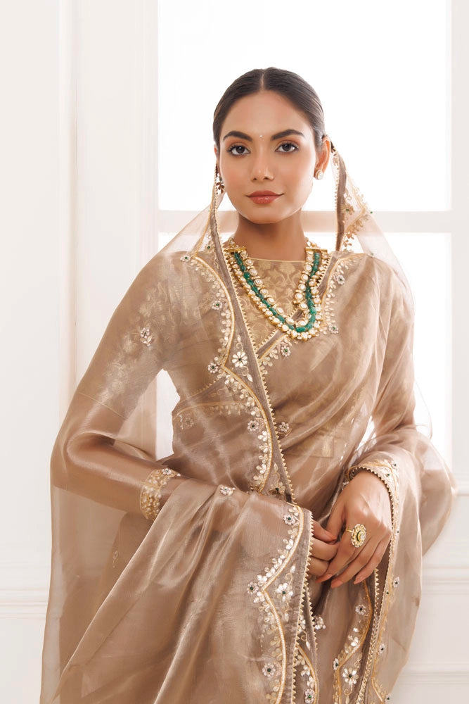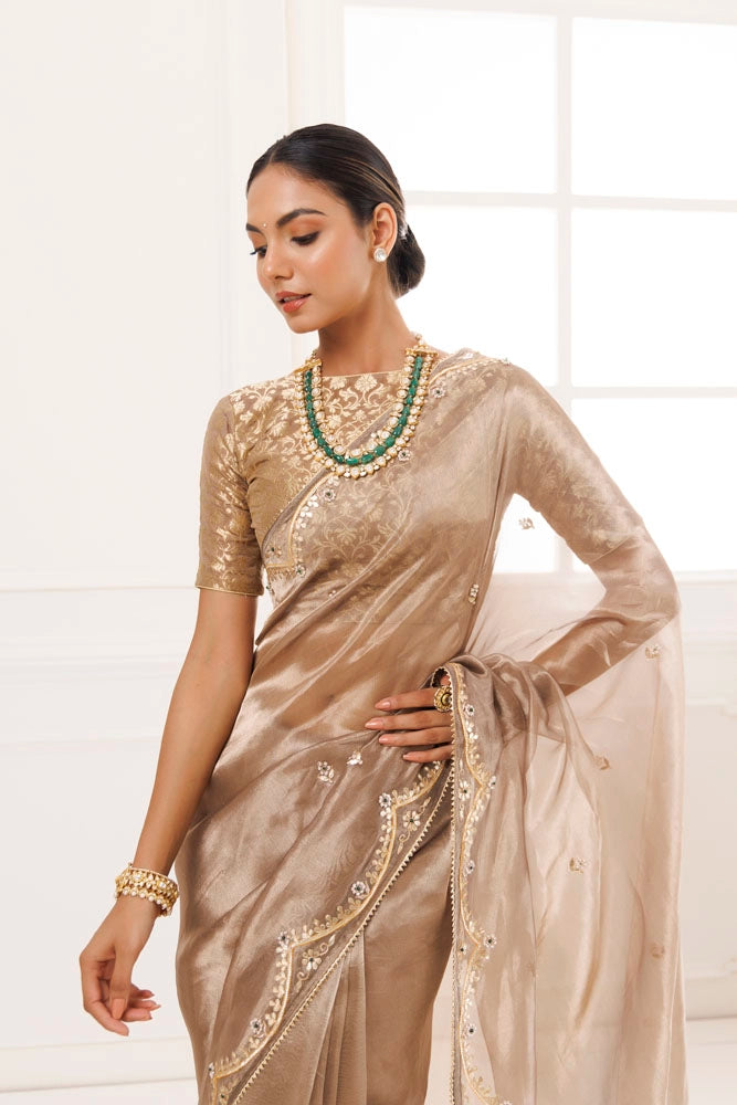Make a statement with this exquisite pure tissue saree from Geroo Jaipur. Hand embroidered with beautiful floral gota patti work highlighted with green pearl work, this saree is a true luxury piece that is both rich and opulent. It is further adorned with beeja lace. The attention to detail and use of high-quality materials make this saree one of a kind, perfect for formal occasions or when you want to feel like royalty. It is paired with brocade unstitched blouse piece.