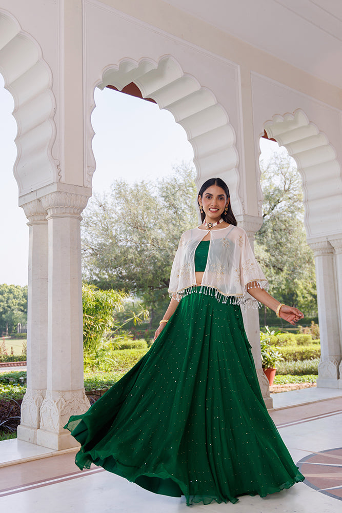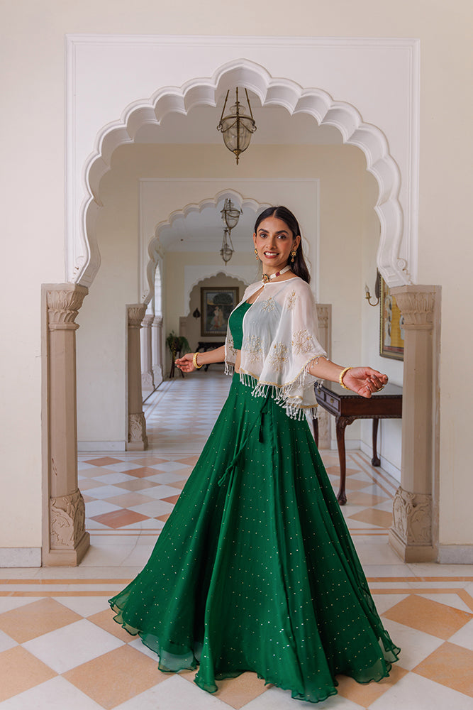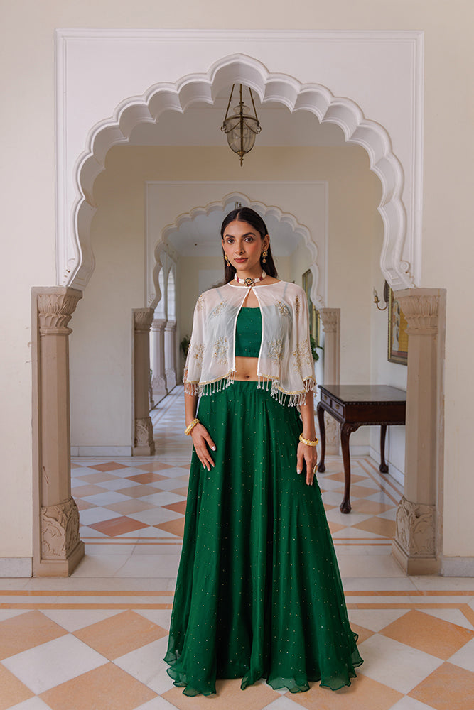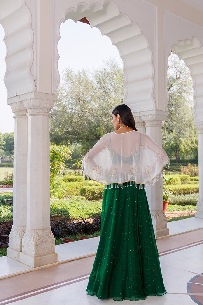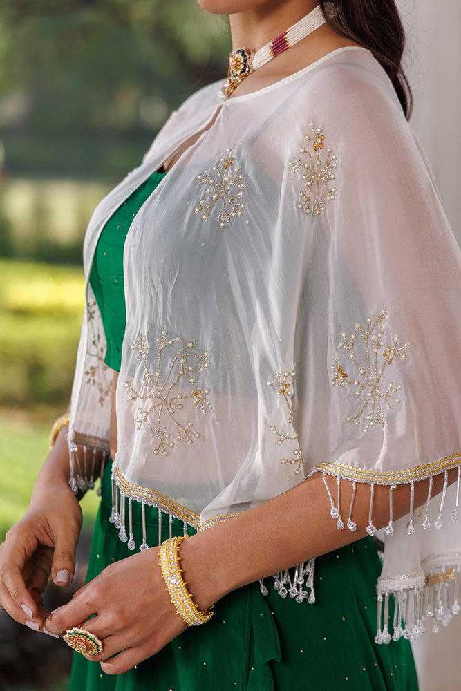 Green Chiffon Lehenga With Mukaish Work And White Embellished Cape