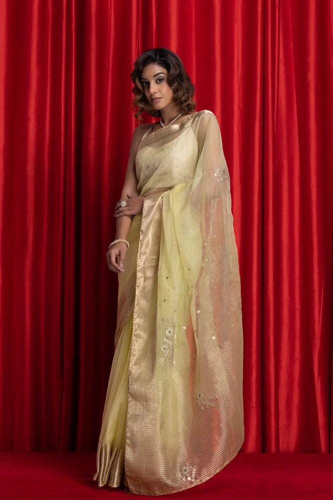 It's time to add enchantment to your looks as Geroo Jaipur brings a mesmerizing Lime Green Organza Banarasi saree. The intricate work of zari woven highlighted pittan butas and beeja lace gives it a masterpiece look. Also, the texture of the organza fabric ensures an alluring drape. It is paired with a contrasting embroidered crepe blouse. Be the ultimate eye-catcher of your next occasion by donning this stunningly saree.