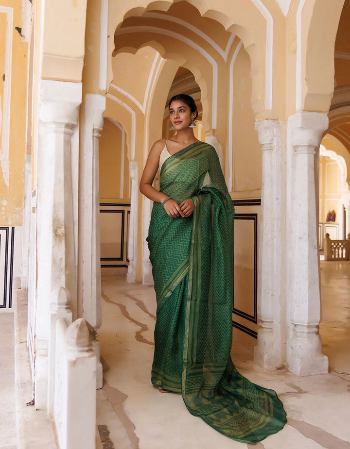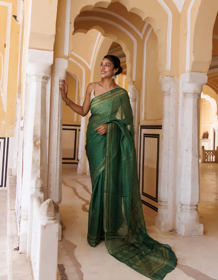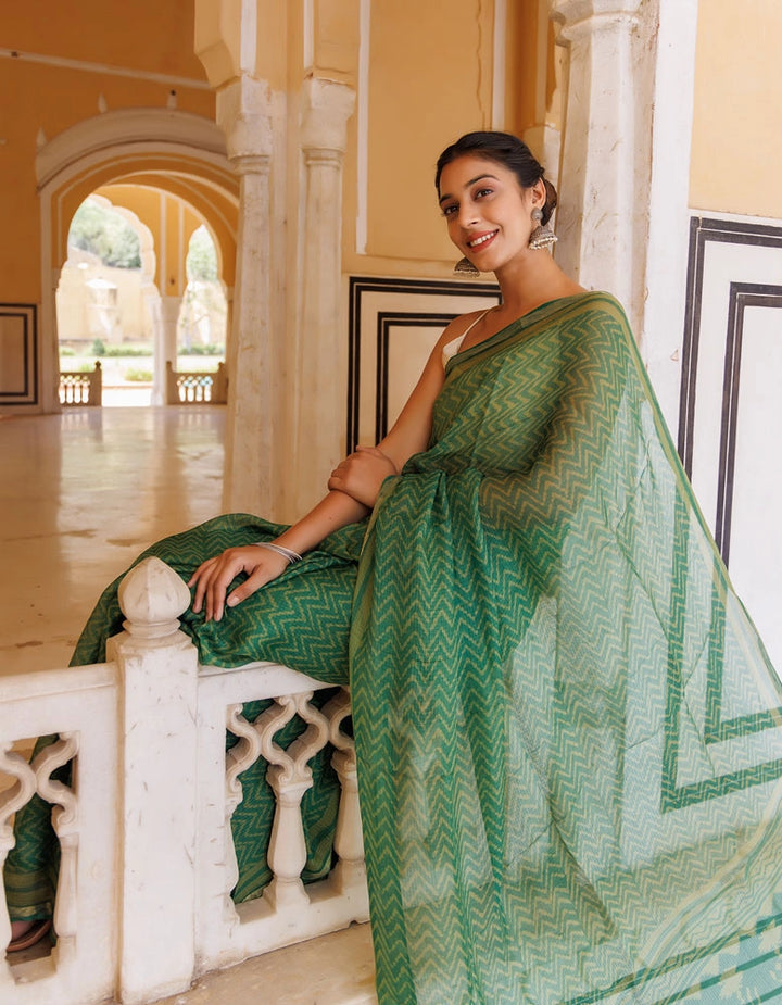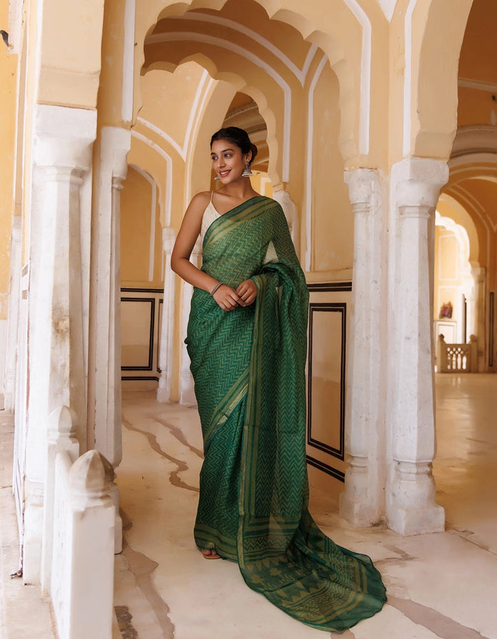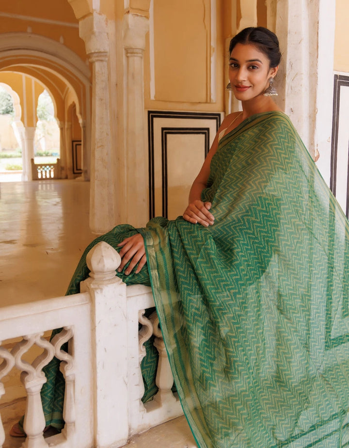 Accentuate your wardrobe with this Green Pure Kota Silk Saree crafted with the effort-intensive technique of hand-block printing with natural vegetable dyes. It is inspired by prints of Daabu.