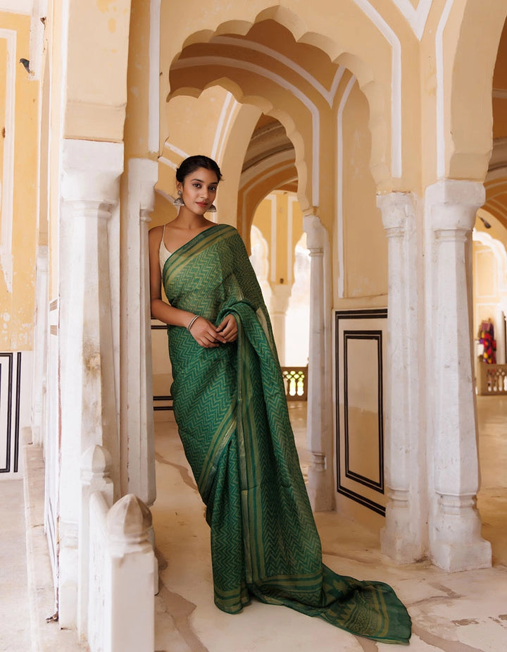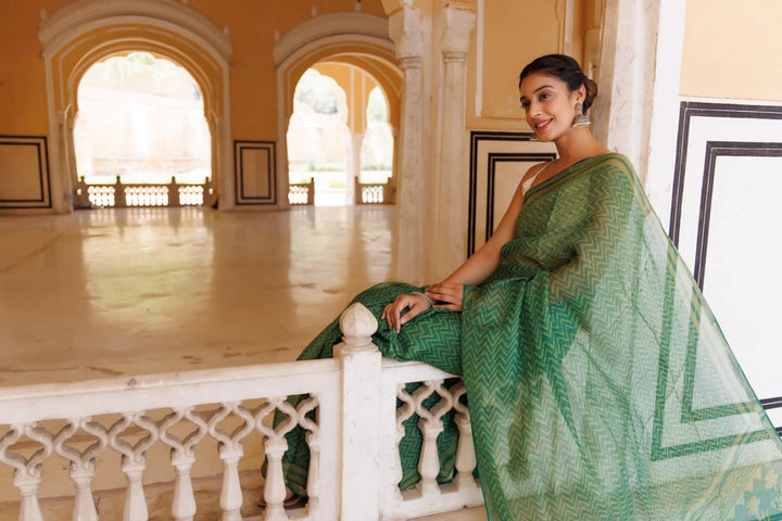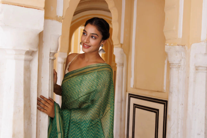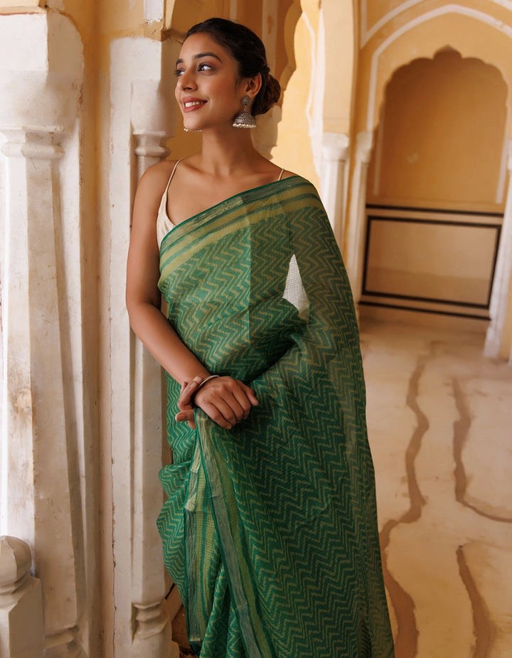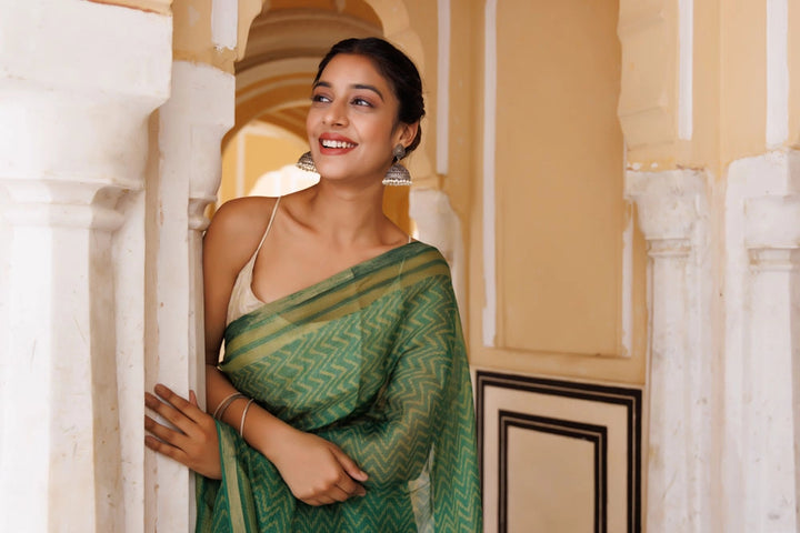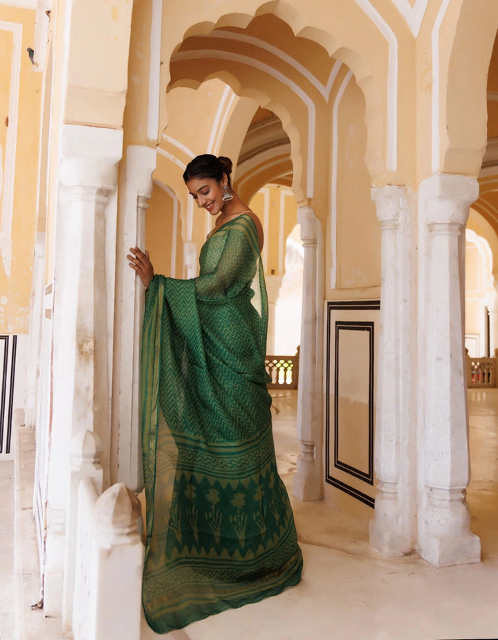 Accentuate your wardrobe with this Green Pure Kota Silk Saree crafted with the effort-intensive technique of hand-block printing with natural vegetable dyes. It is inspired by prints of Daabu.