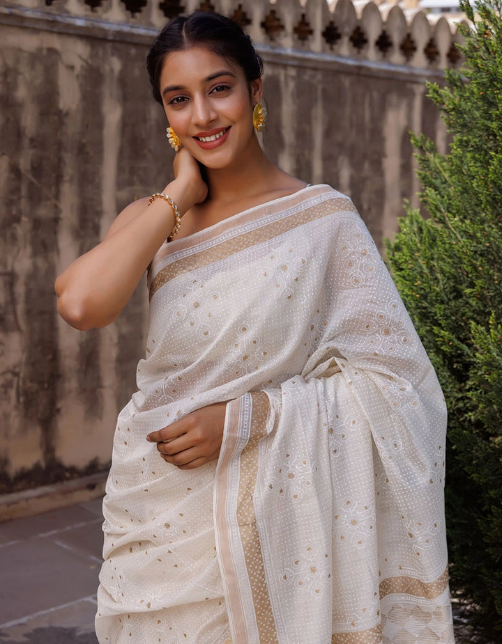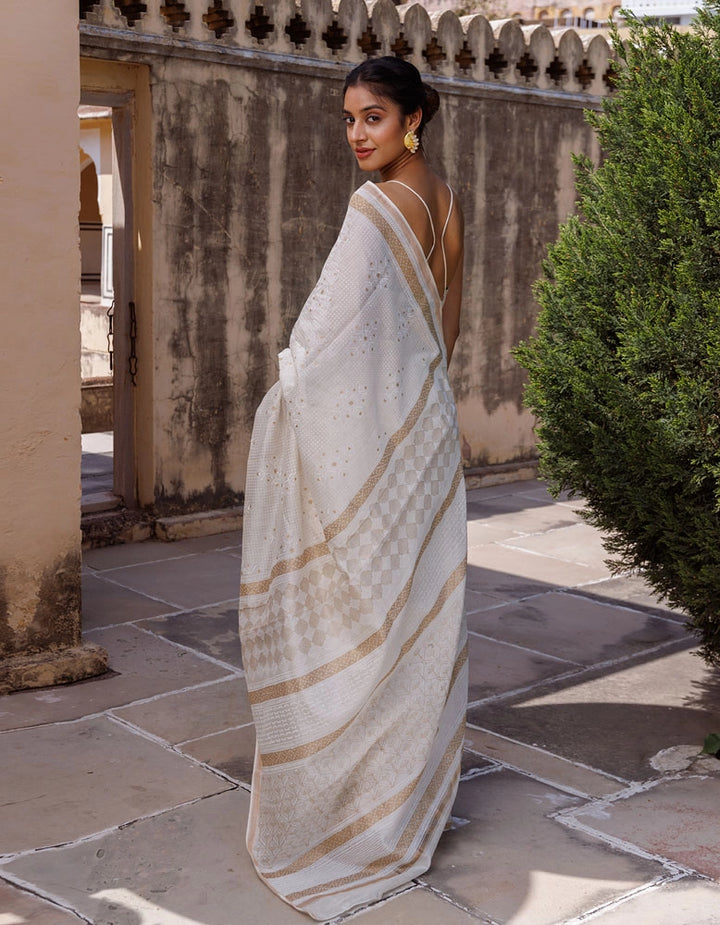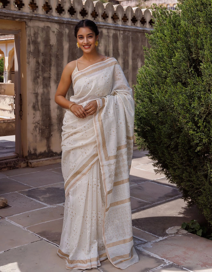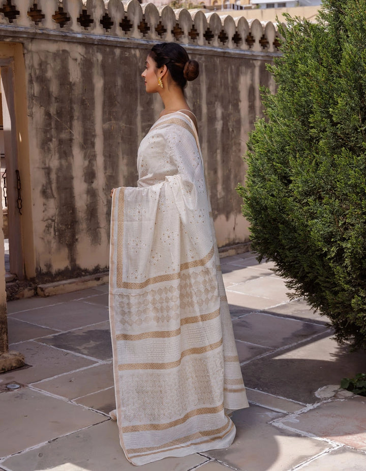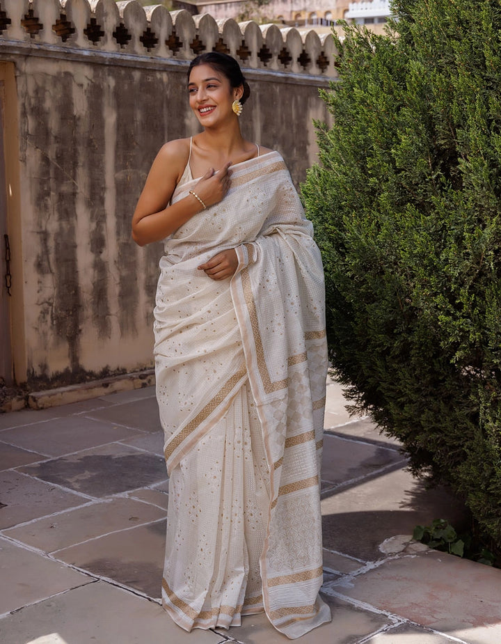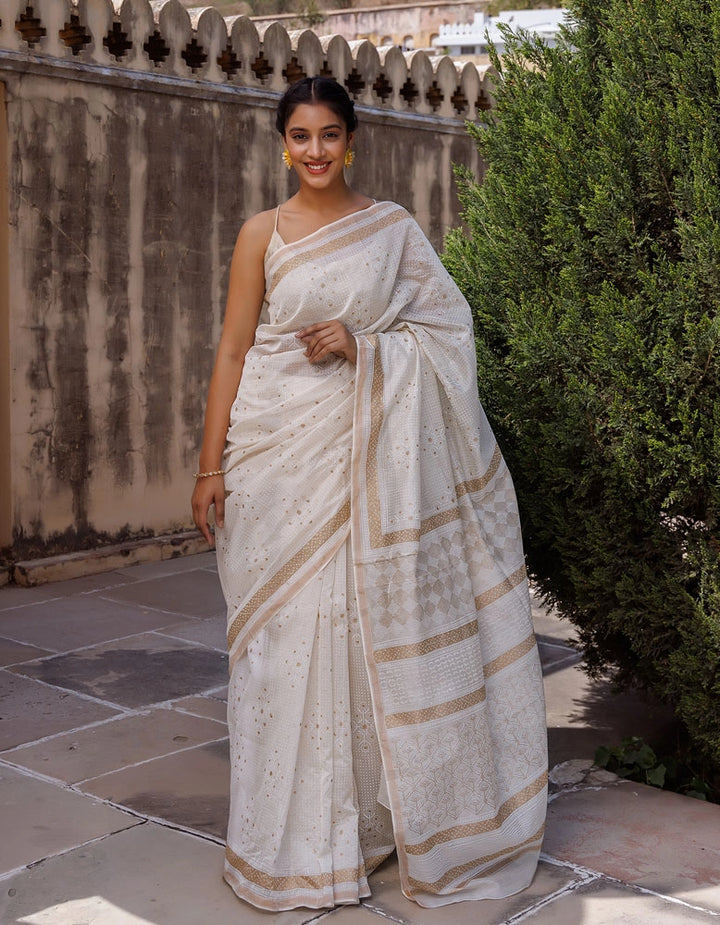 White Hand Block Printed Bagru Pure Chanderi Sustainable Saree