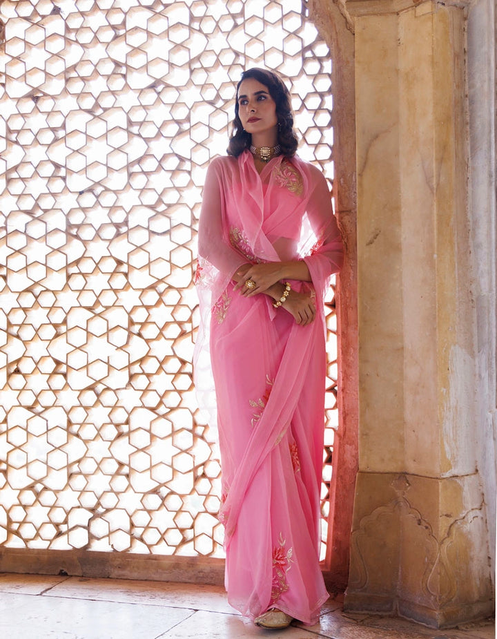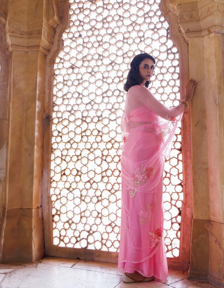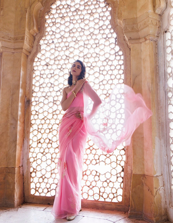 Tripti Dimri in Pink Handcrafted Aari-Sequins Chiffon Saree