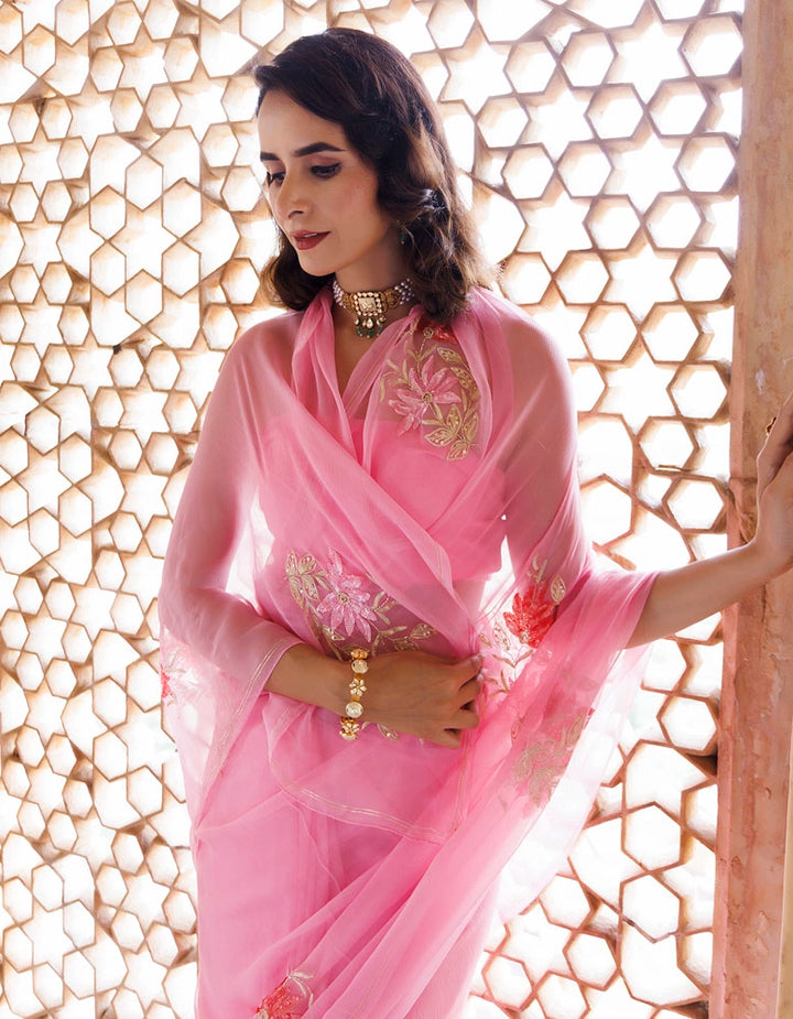 Geroo Jaipur brings an elegant Hand Embroidered Chiffon saree to grace your festive season. The mesmerizing handcrafting of sequins and aari work in floral patterns transform this saree into an artistic treasure making it a wardrobe must-have. The glory of chiffon fabric makes it lightweight and manageable whereas the attractive shade of pink makes it the right choice for the festive season. It is paired with a matching unstitched blouse piece.