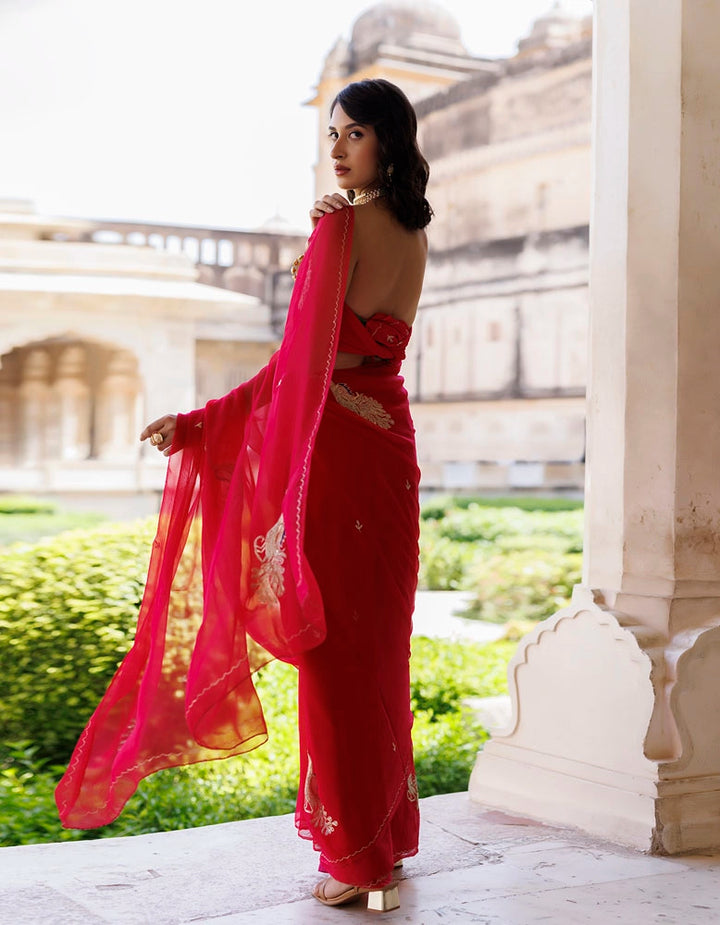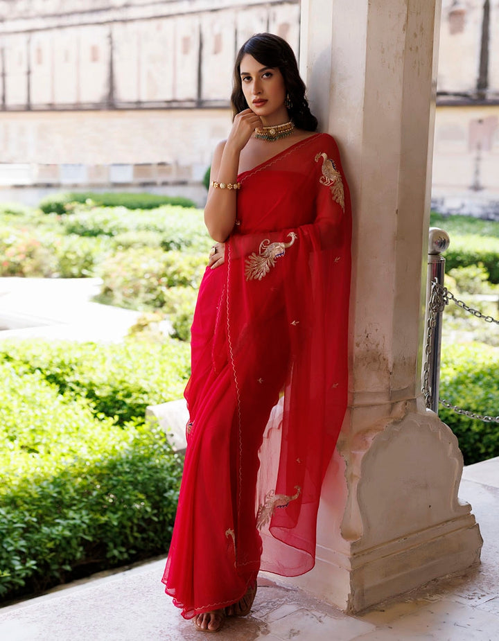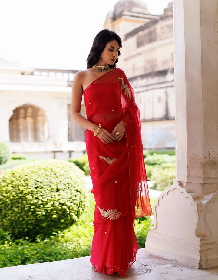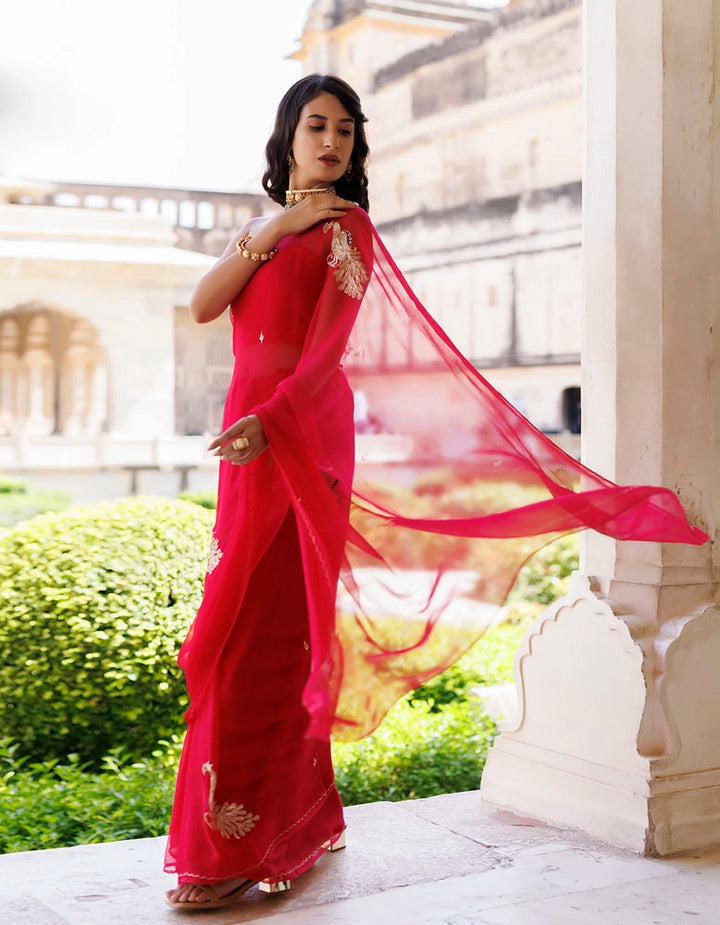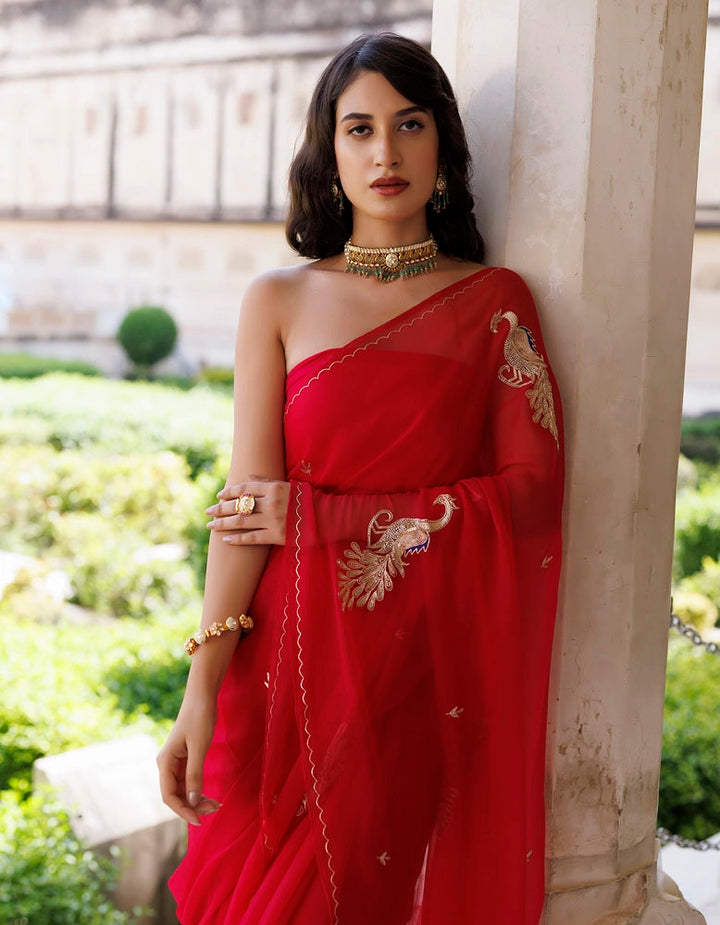 Geroo Jaipur brings an elegant Hand Embroidered Chiffon saree to grace your festive season. The mesmerizing handcrafting of peacock motif in aari and tube work transforms this saree into an artistic treasure making it a wardrobe must-have. The glory of chiffon fabric makes it lightweight and manageable whereas the attractive shade of fushia pink makes it the right choice for the festive season. It is paired with a georgette unstitched blouse piece.