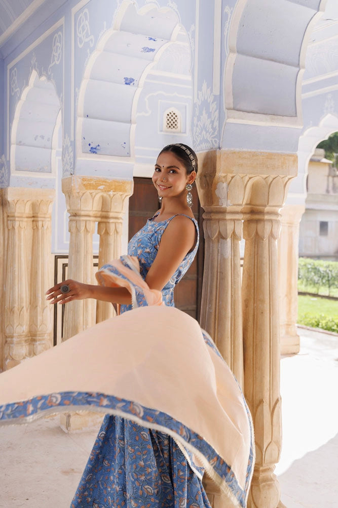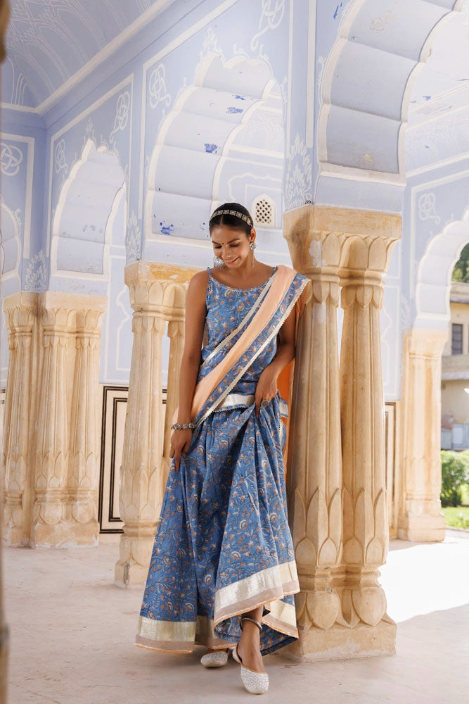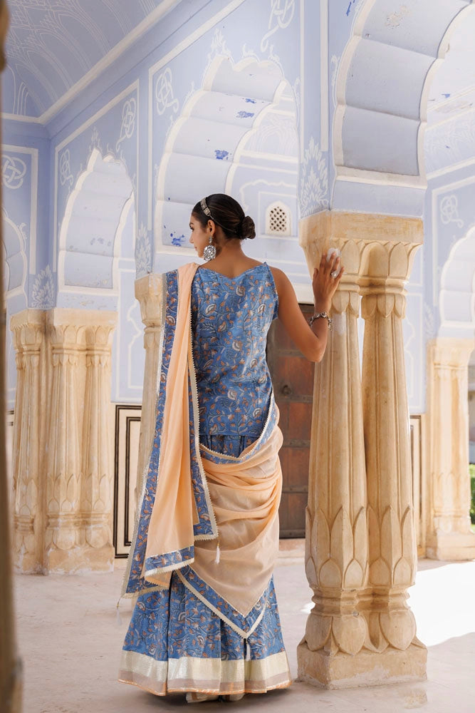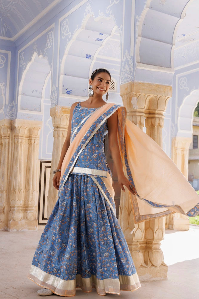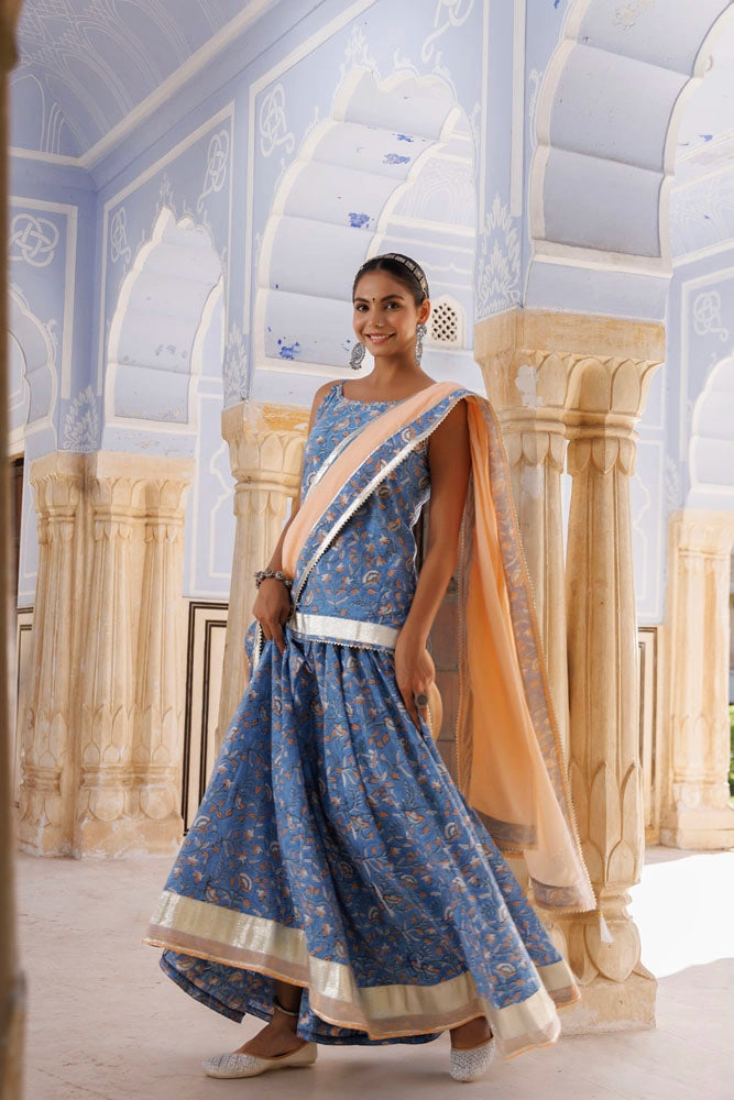 Handcrafted Light Blue-Peach Block Printed Cotton Skirt Set