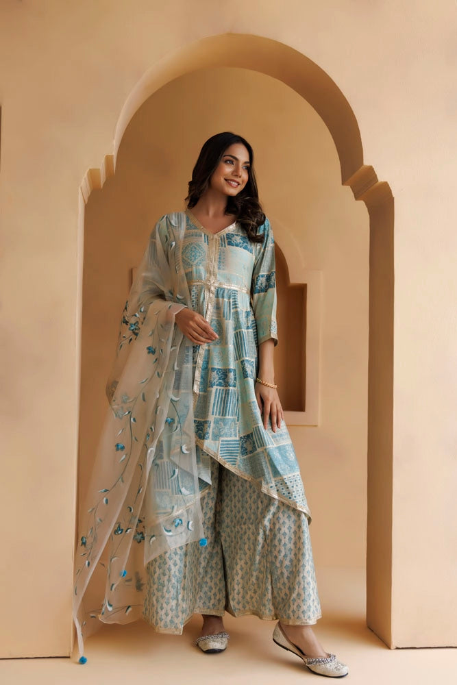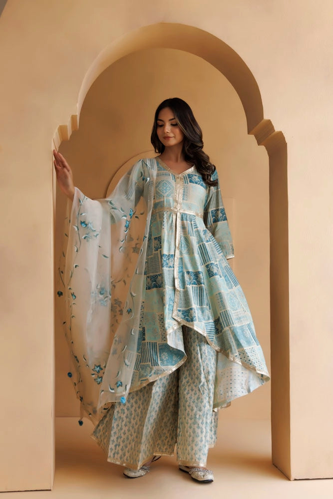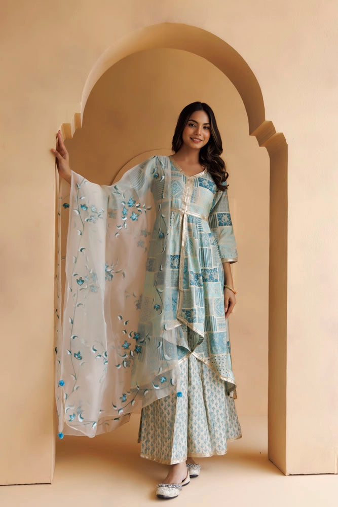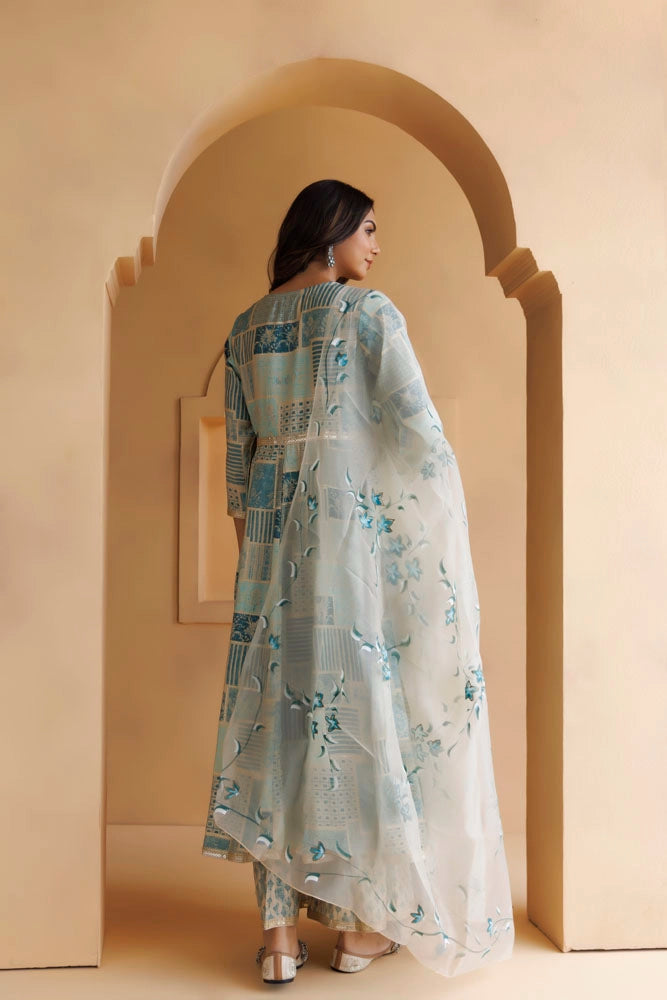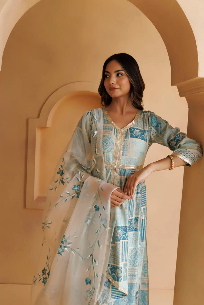 Light Blue Printed Kurta Set With Handpainted Organza Dupatta