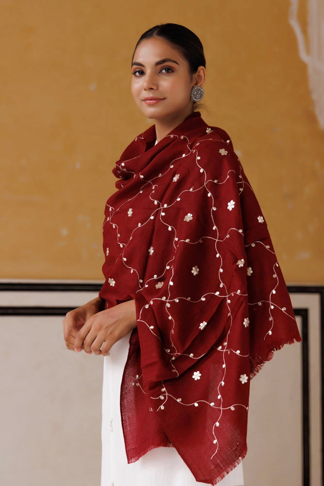 Wrap yourself in luxury with this hand-embroidered gota patti woolen shawl. It is intricately hand-crafted by skilled artists with fine embroidery of gota paati jaal. The soft texture and warmth of the shawl make it perfect for keeping you cozy and stylish.