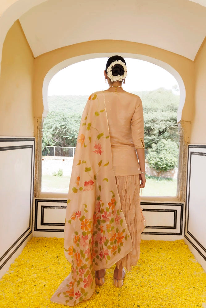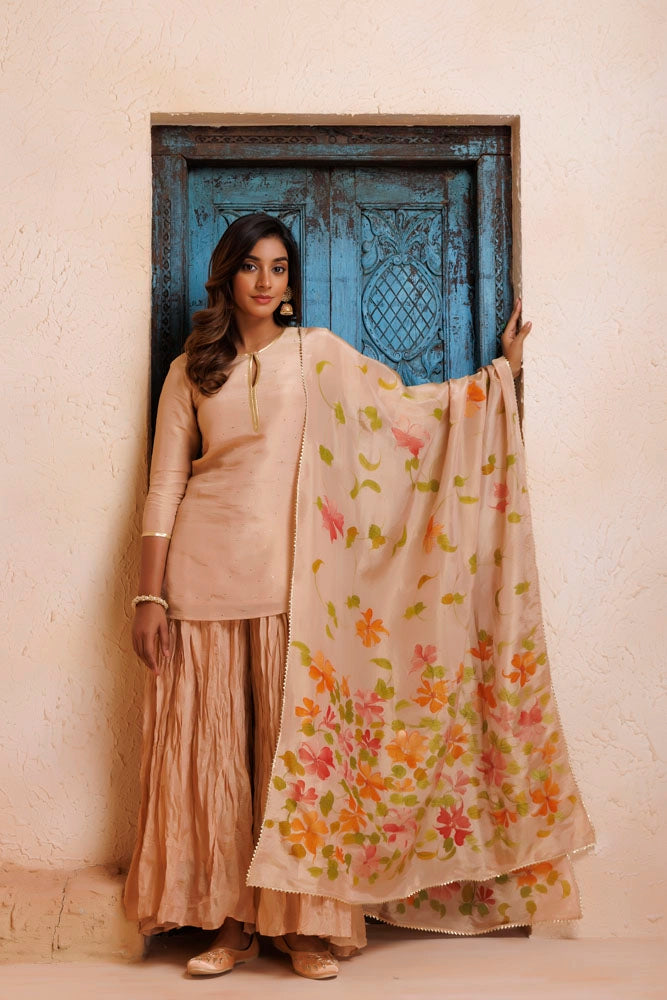 Onion Pink Chanderi Mukaish Embroidered Garara Kurta Set with Organza Hand Painted Dupatta