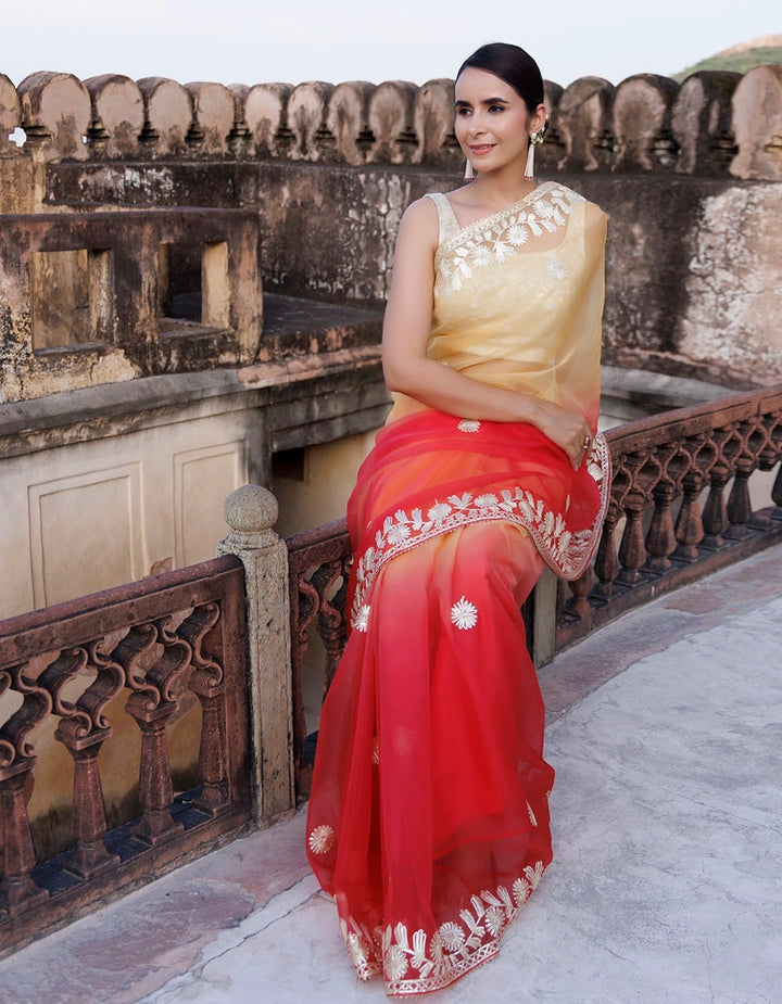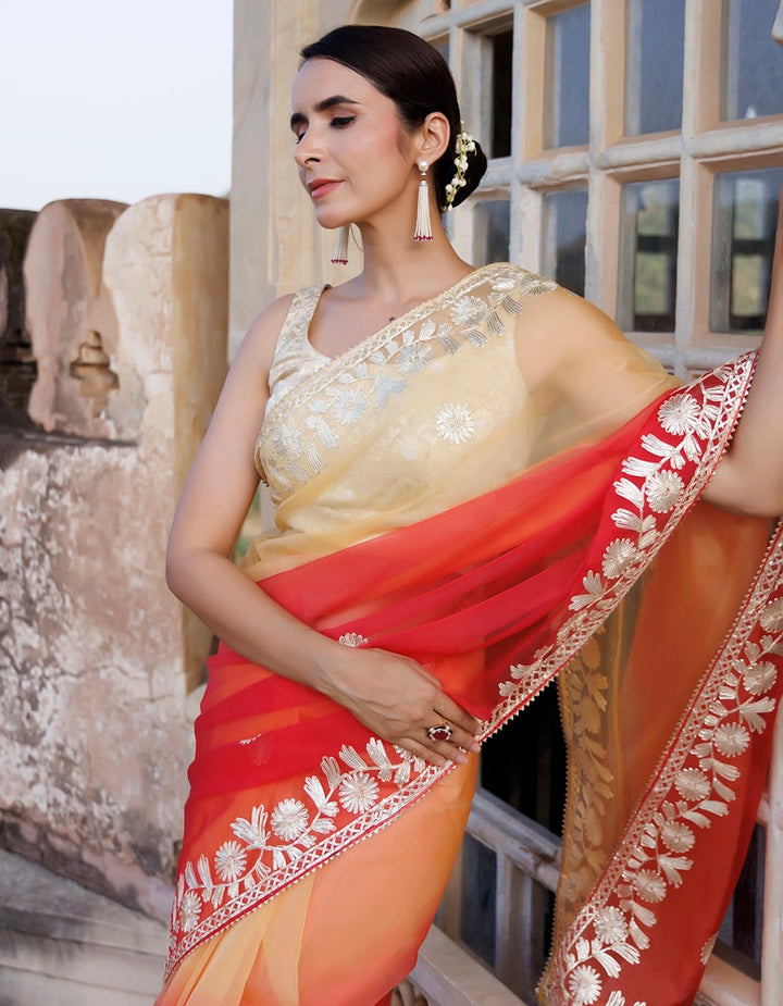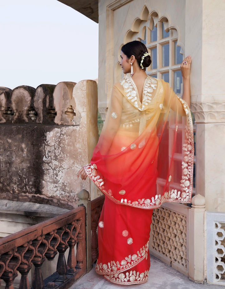 Red Yellow Shaded Handcrafted Gota Patti Organza Saree