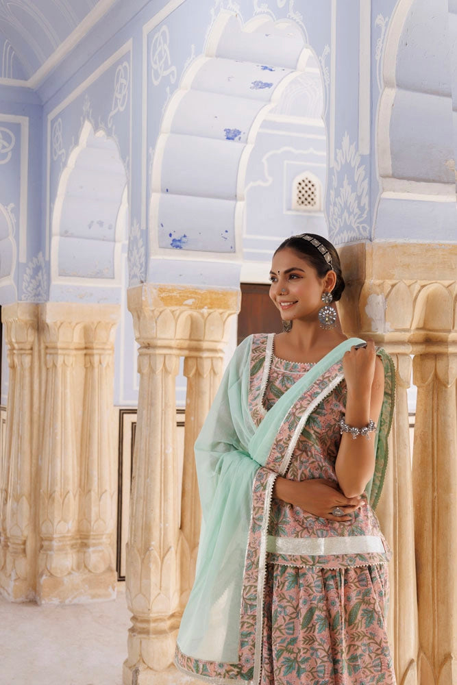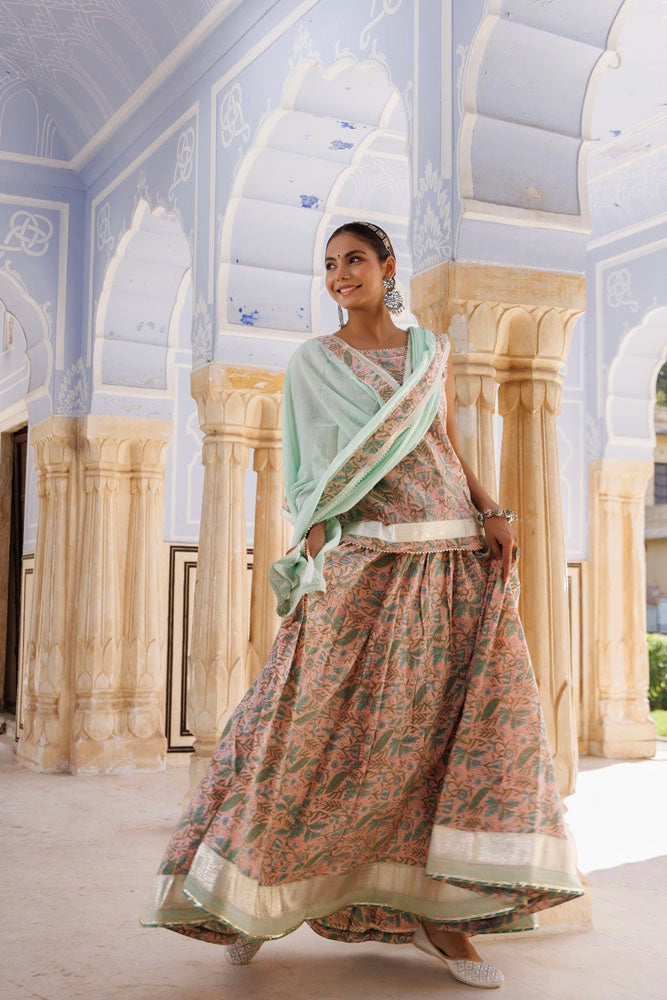 Handcrafted Peach-Green Block Printed Cotton Skirt Set