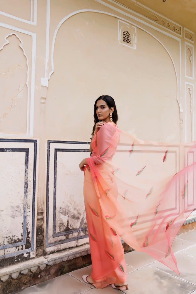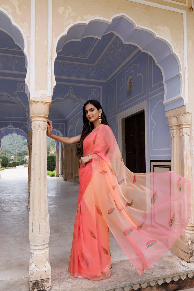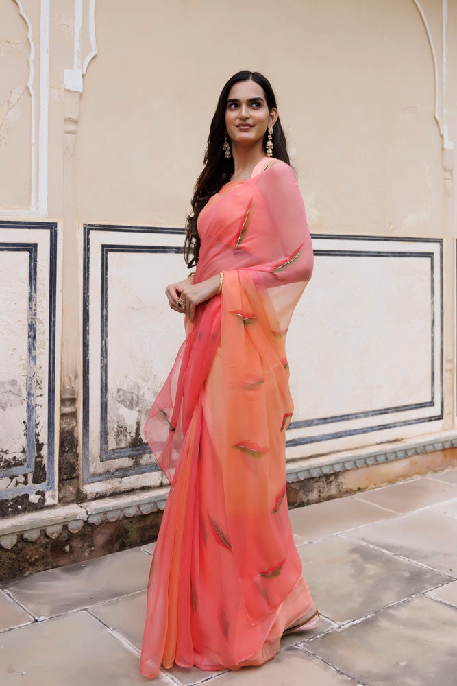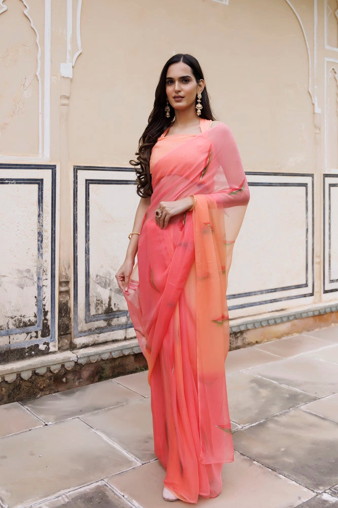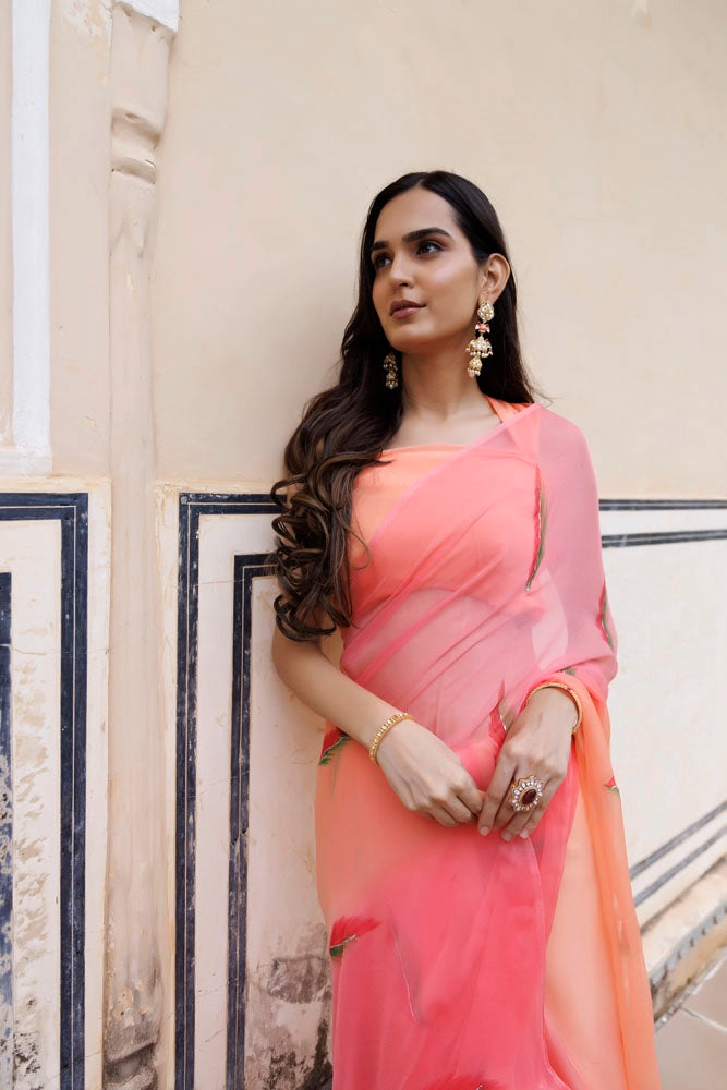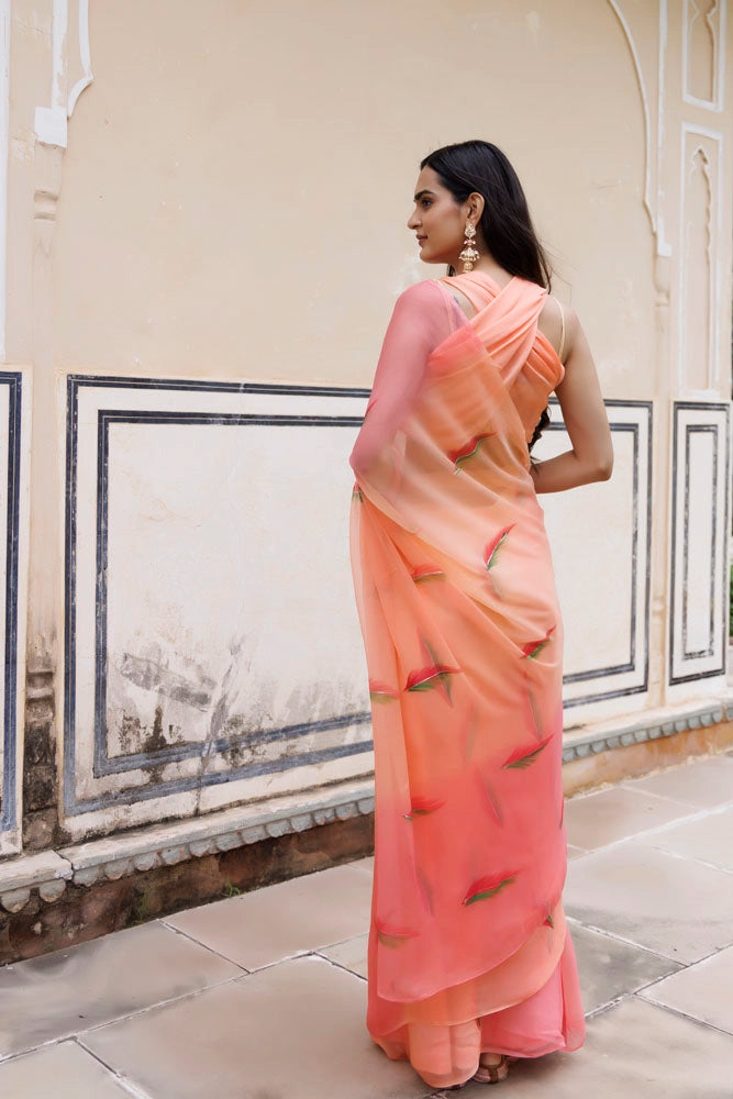 Peach Shaded Hand Painted Floral Chiffon Saree