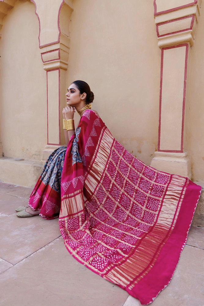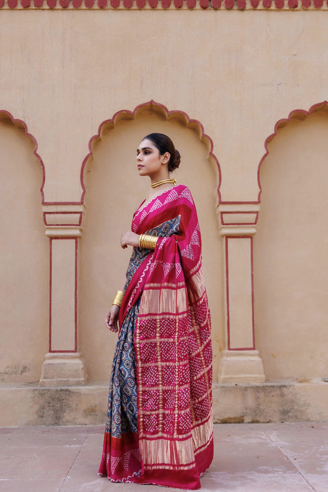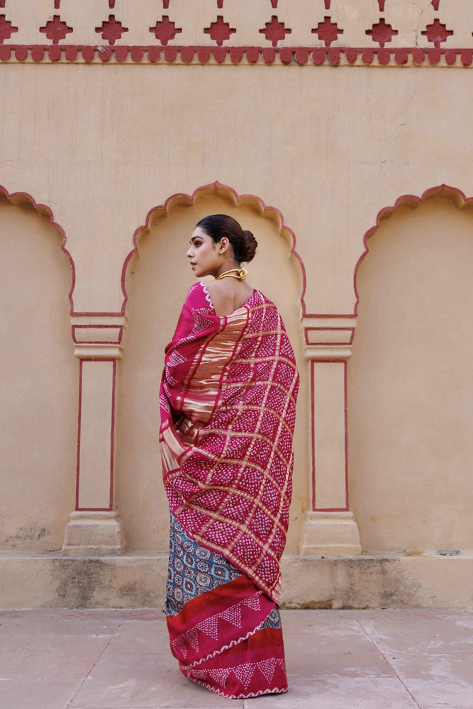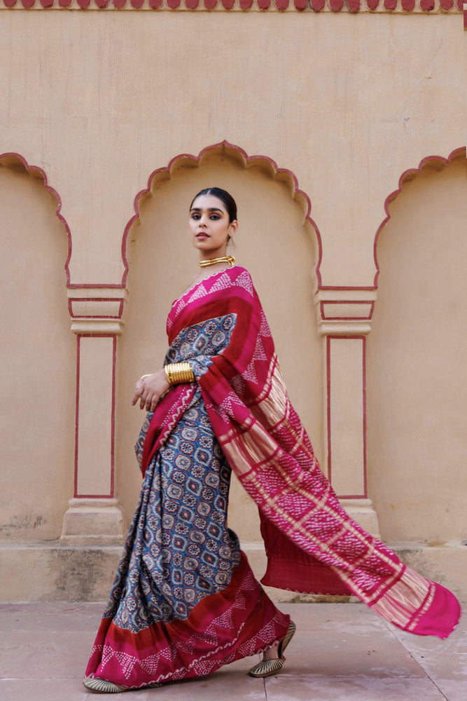Pink Handwoven Ajrakh Bandhani Pure Silk Saree
