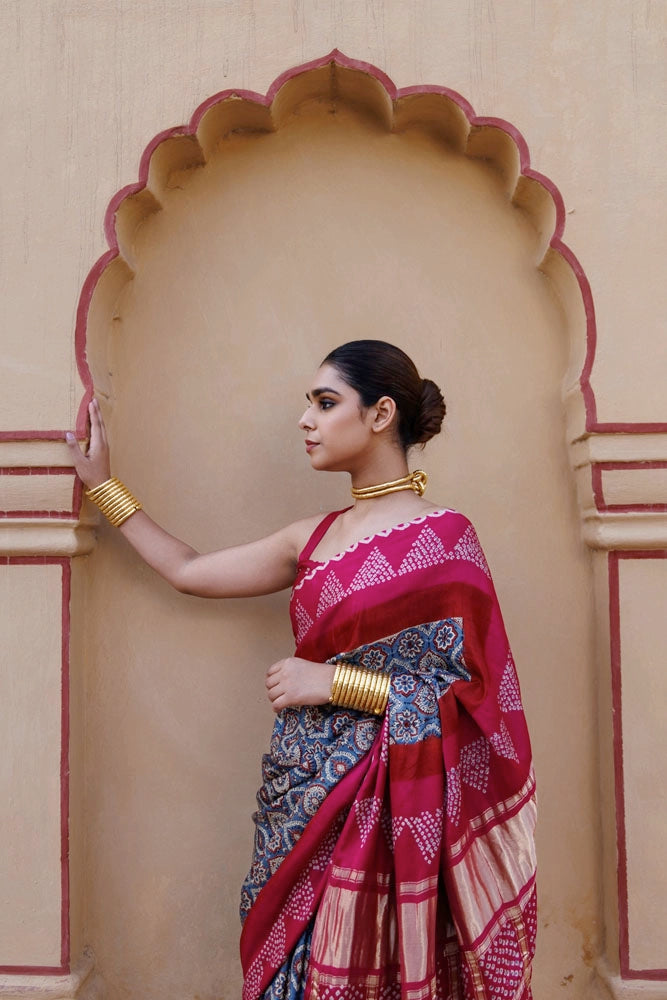 - Craft: Ajrakh hand block-printed and adorned with Zari detailing, meticulously crafted by Gujarat’s artisans through centuries-old methods..
