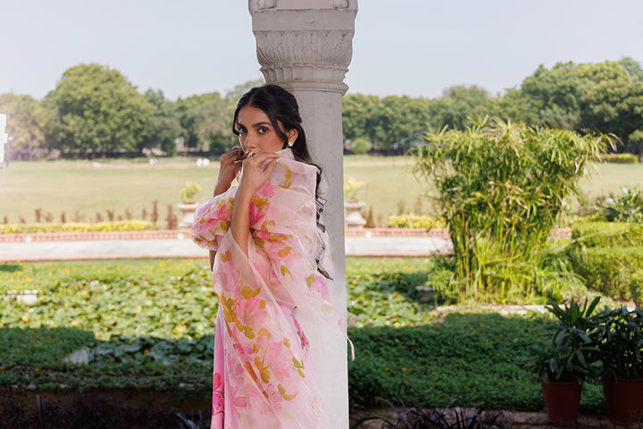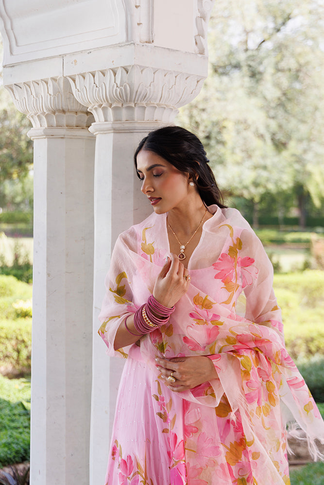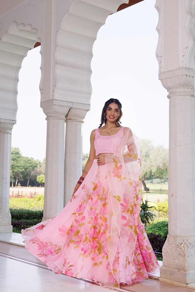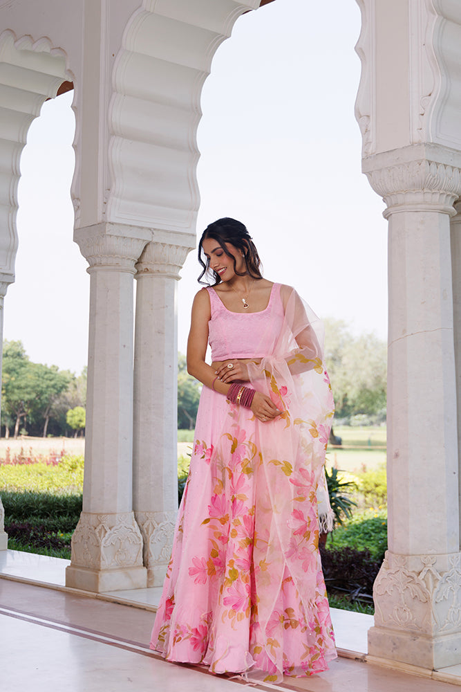Pink Hand Painted Chiffon Lehenga With Mukaish Work And Hand-Painted Organza Dupatta