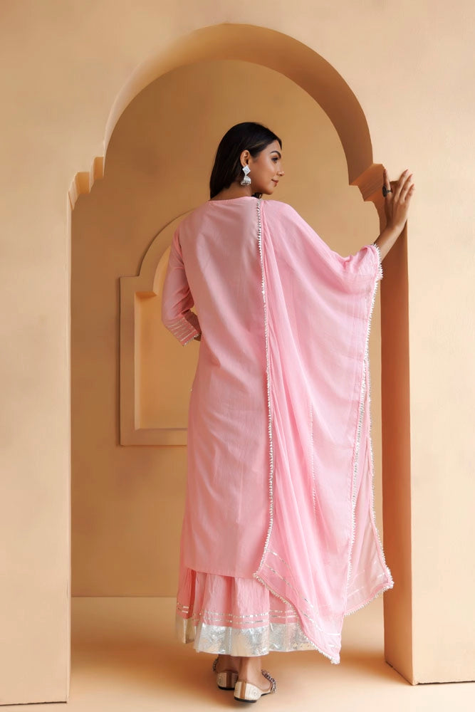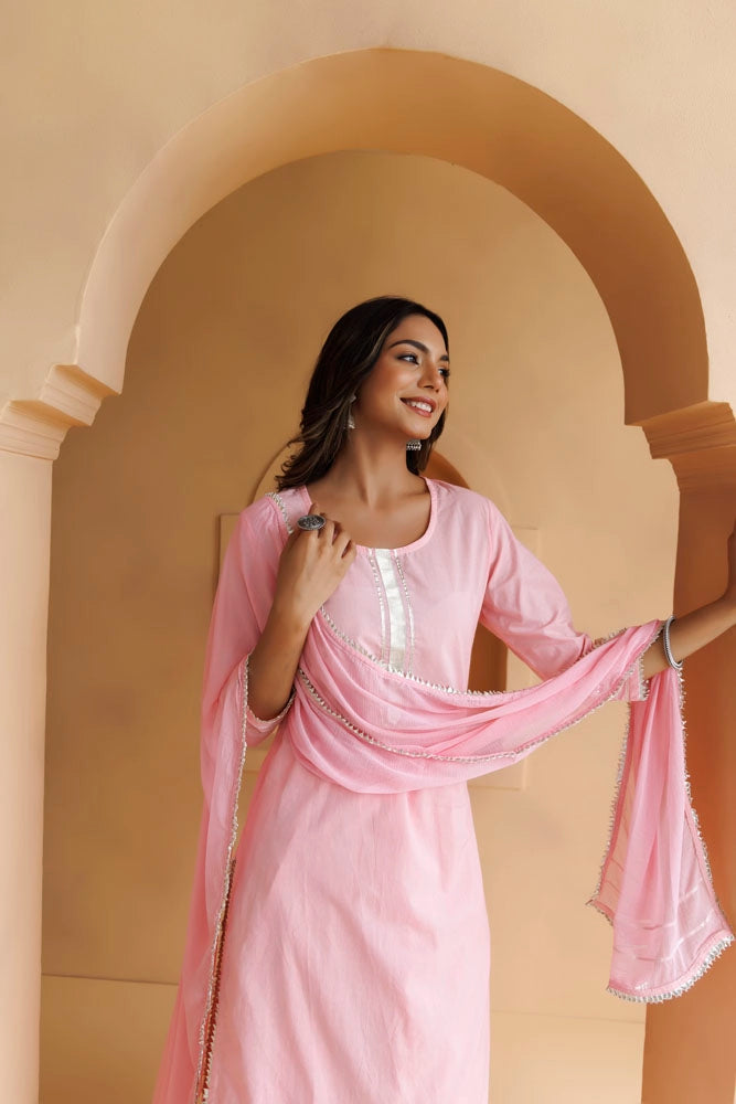 Pastel Pink Handcrafted Straight Cotton Kurta Set With Dupatta