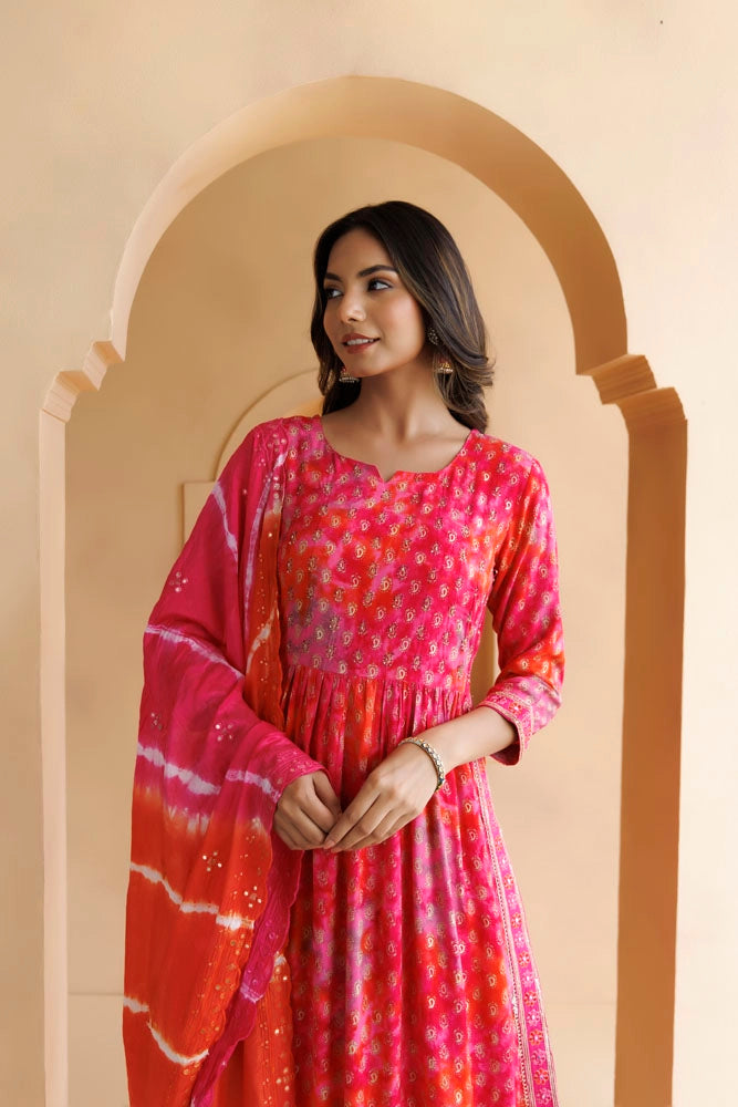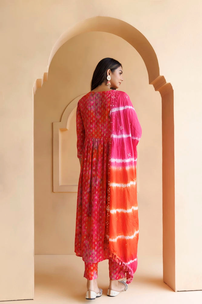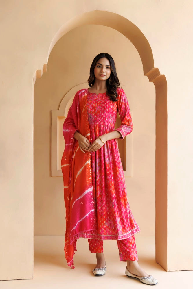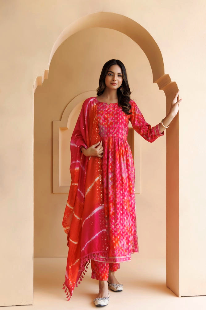 Pink Shaded Cotton-Rayon Embroidered Kurta Set with Silk Dupatta