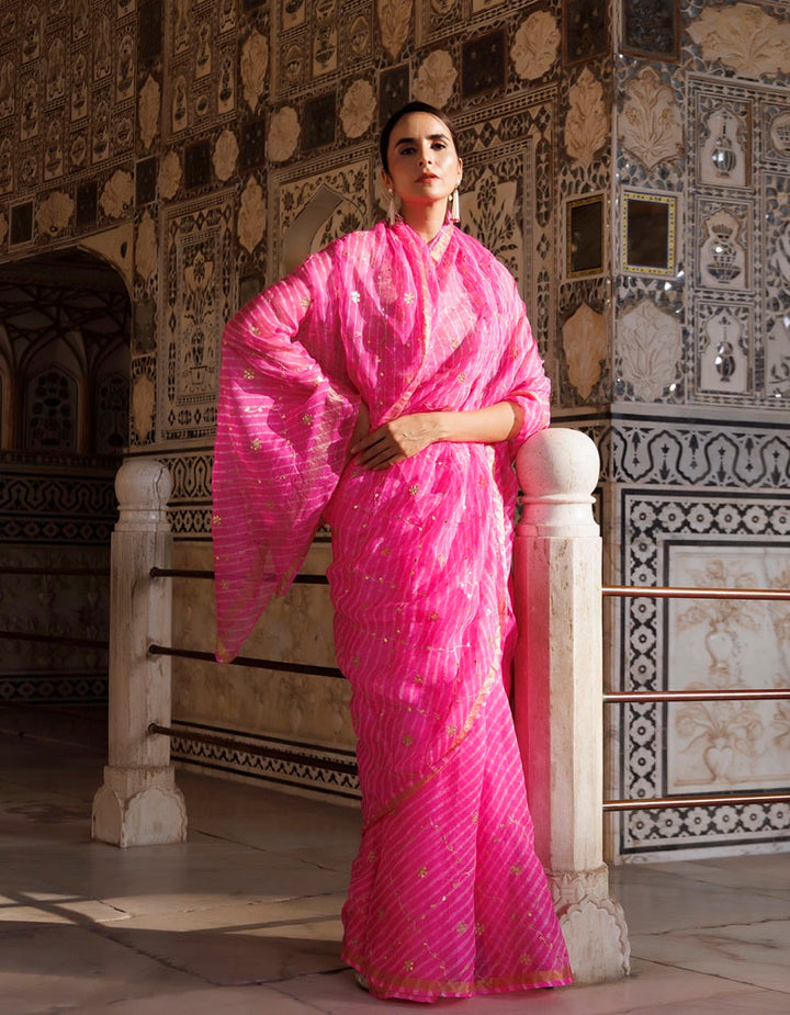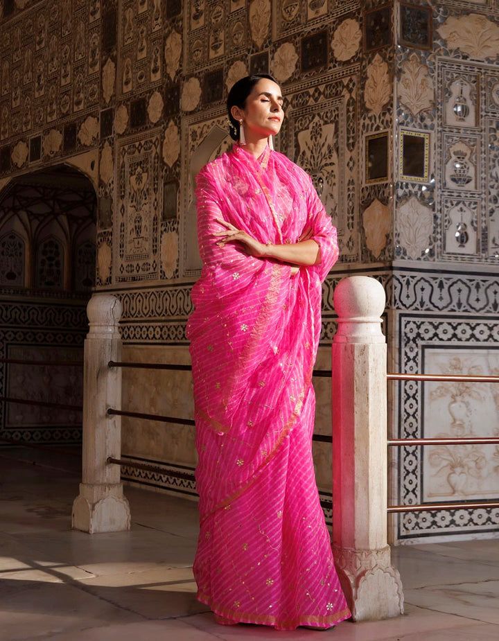 Geroo Jaipur brings an elegant Hand Embroidered Pure Kota silk leheriya saree to grace your festive season. The mesmerizing handcrafting of gotta patti work in jaal patterns transform this saree into an artistic treasure, giving timeless touch and making it a wardrobe must-have. The saree is adorned with a golden zari border in an attractive shade of pink making it the right choice for the festive season. It is paired with a matching silk unstitched blouse piece.