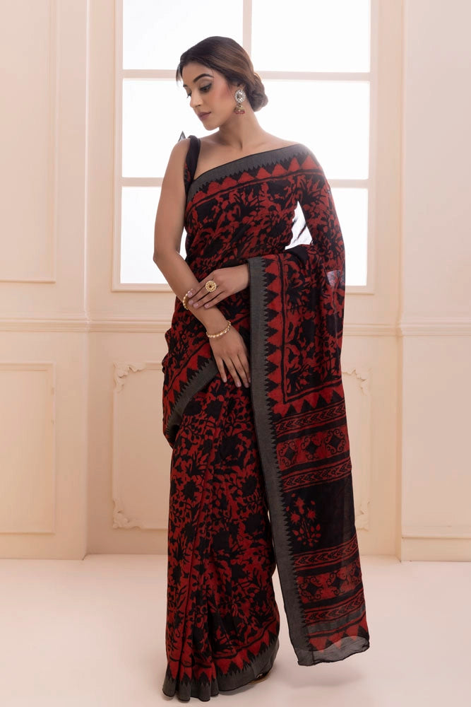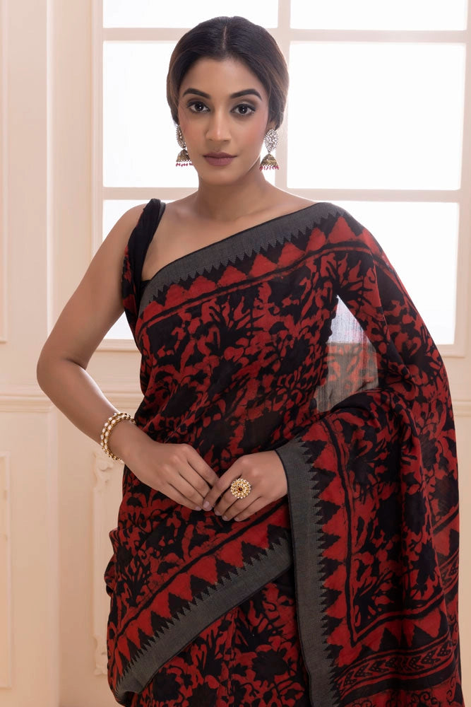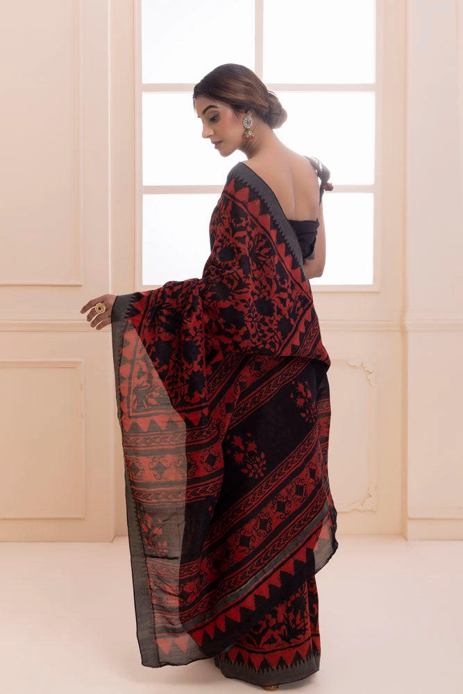 Red-Black Hand Block Printed Bagru Pure Chanderi Sustainable Saree
