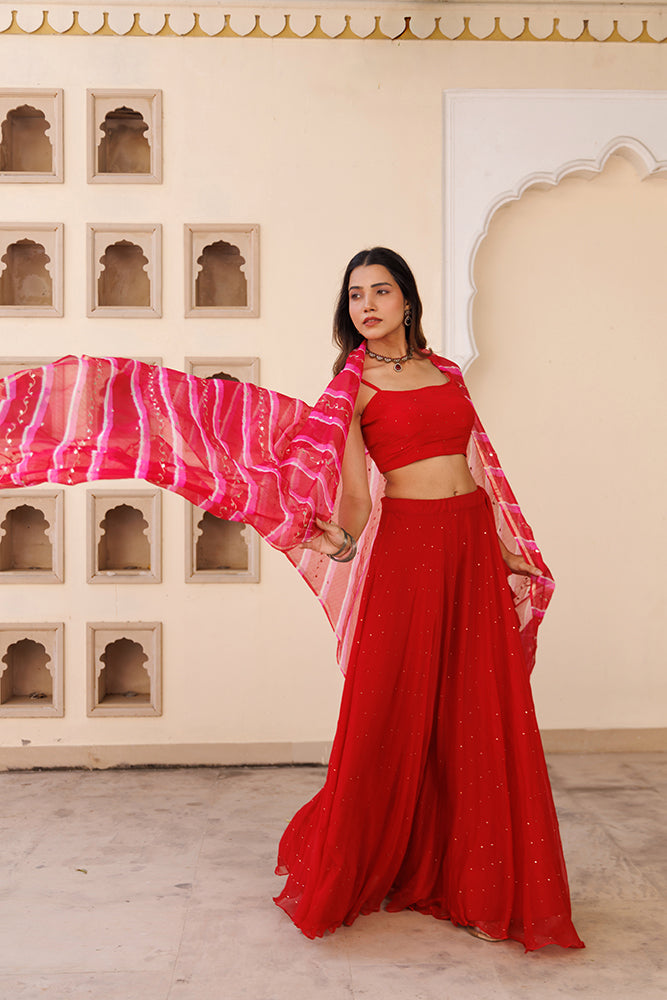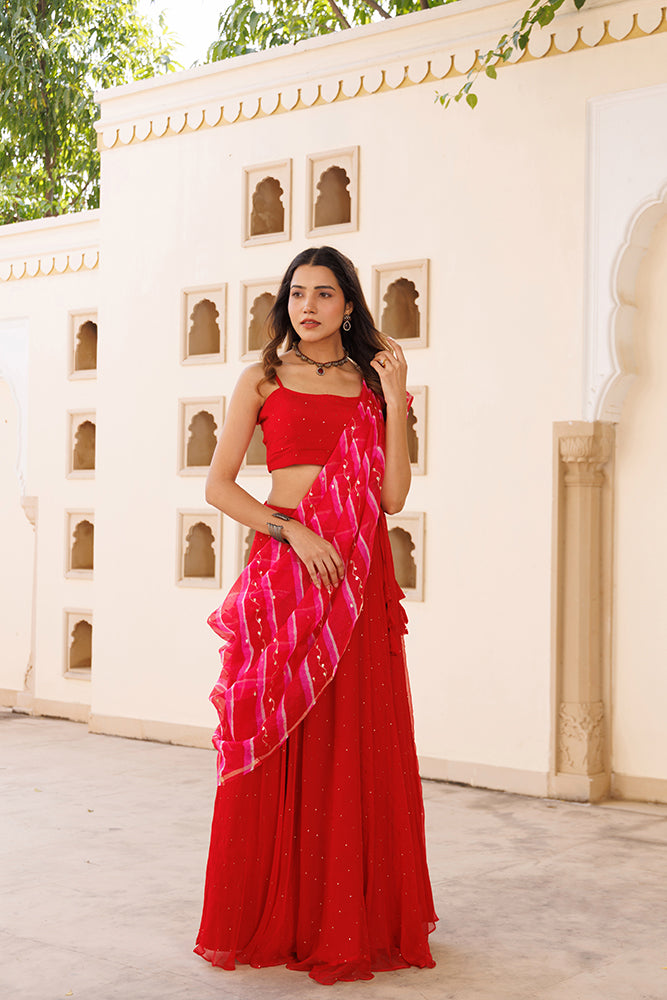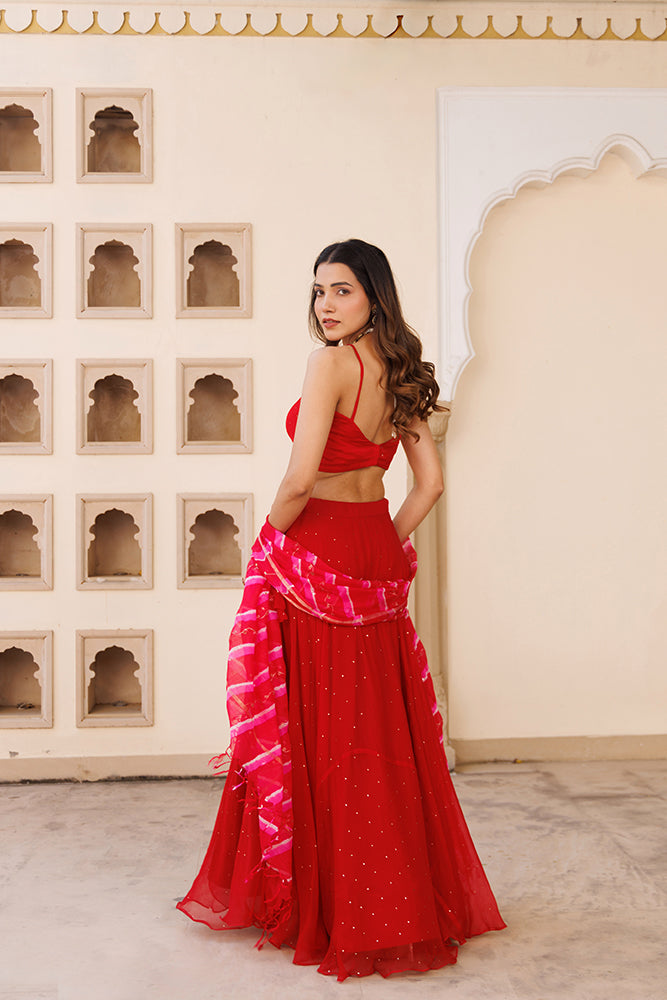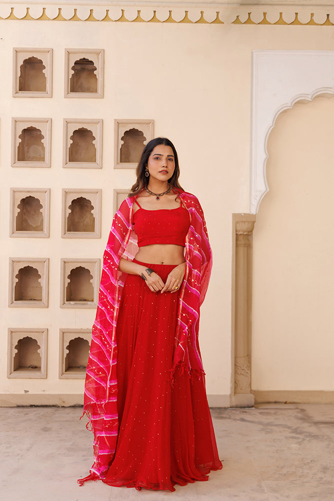 Red Contemporary Lehenga With Mukaish Shimmer And Hand-Dyed Leheriya Kota Silk Dupatta
