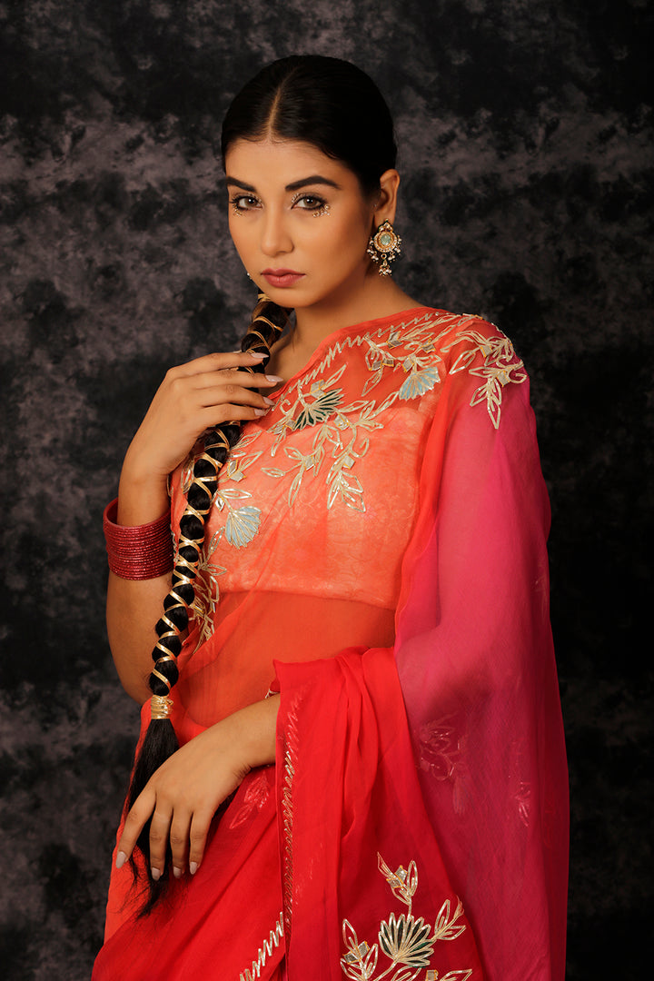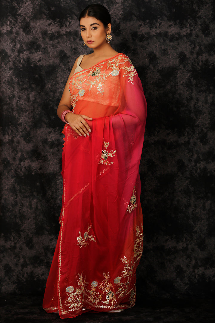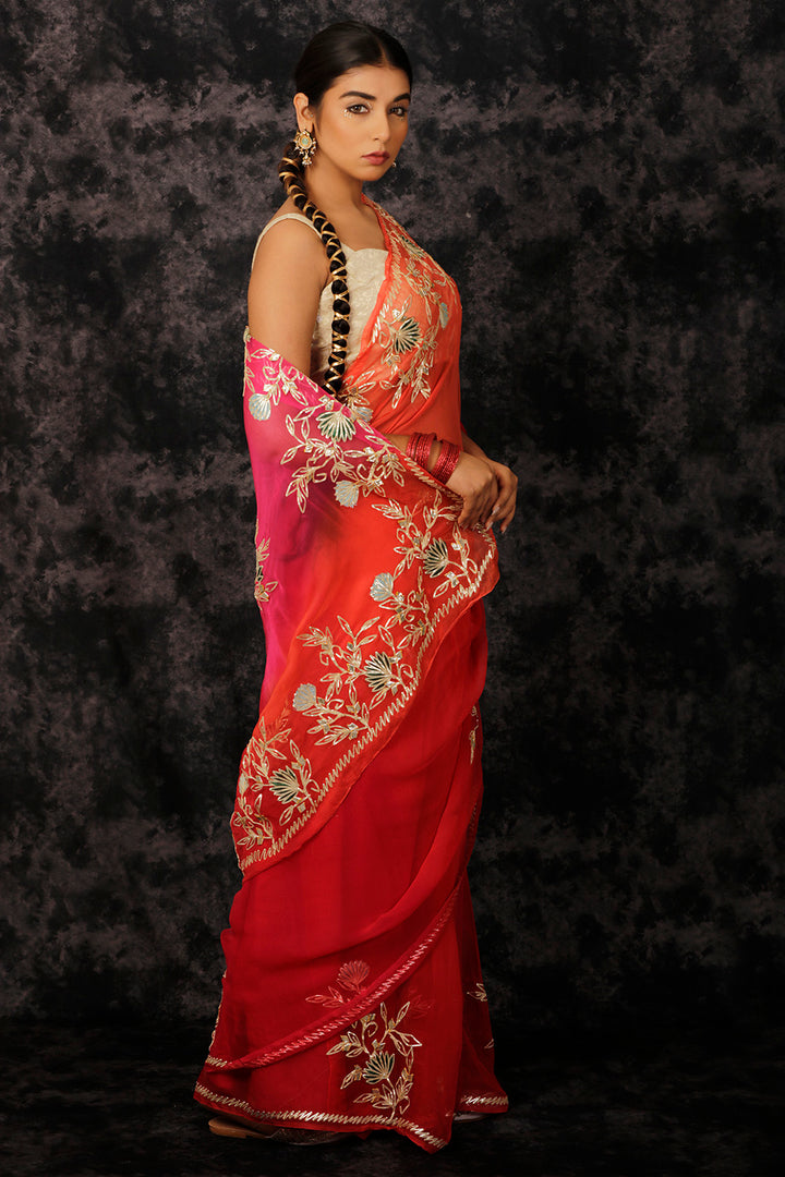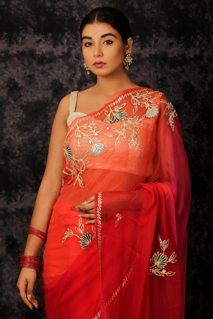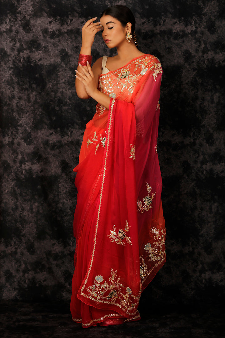 Geroo Jaipur's wedding collection features an ombre-dyed chiffon saree in shades of Red which is further embellished with gotta work all over. It comes with a matching blouse piece in crepe fabric. The glory of Chiffon Fabric makes it lightweight and manageable whereas the fine handcrafting of gota work all over gives it a festive look. Style this saree with your favorite jewelry and get ready to flaunt!
