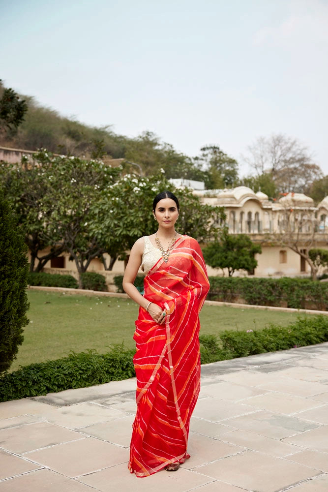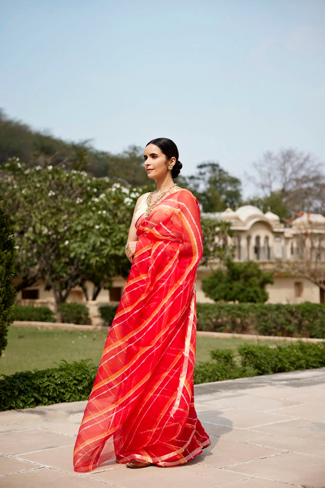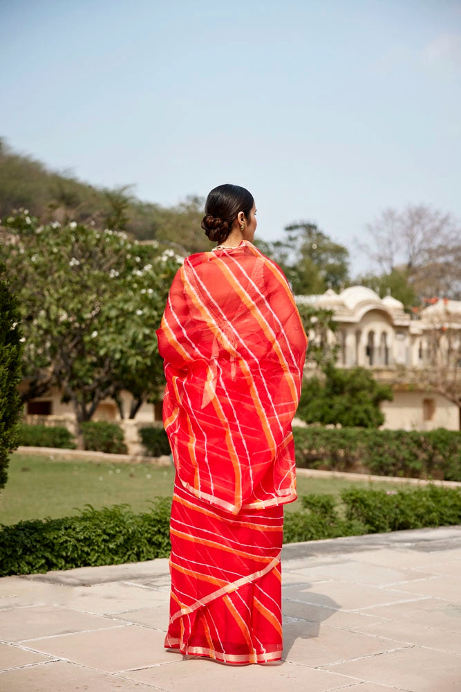 Geroo Jaipur brings an elegant hand-crafted red-orange leheriya saree to grace your festive season. The saree is crafted in pure kota silk using the effort-intensive technique of tie-dye. The mesmerizing leheriya patterns transform this saree into an artistic treasure, giving timeless touch and making it a wardrobe must-have. The saree is adorned with a golden one-inch zari border and paired with a matching unstitched blouse piece which adds a lot of festive glam to the saree.