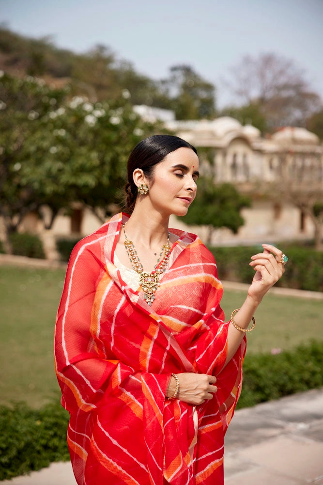 Red Orange Pure Kota Silk Hand Dyed Leheriya Saree