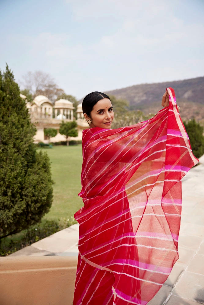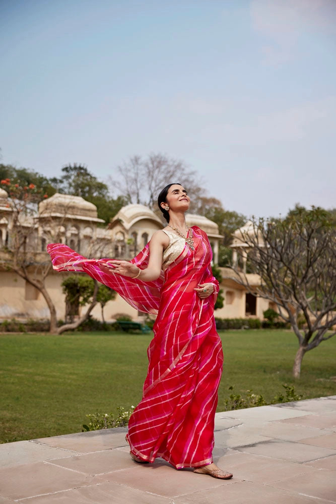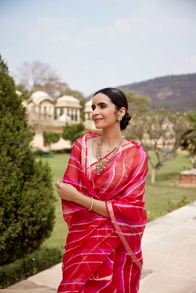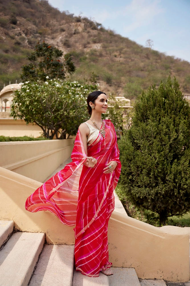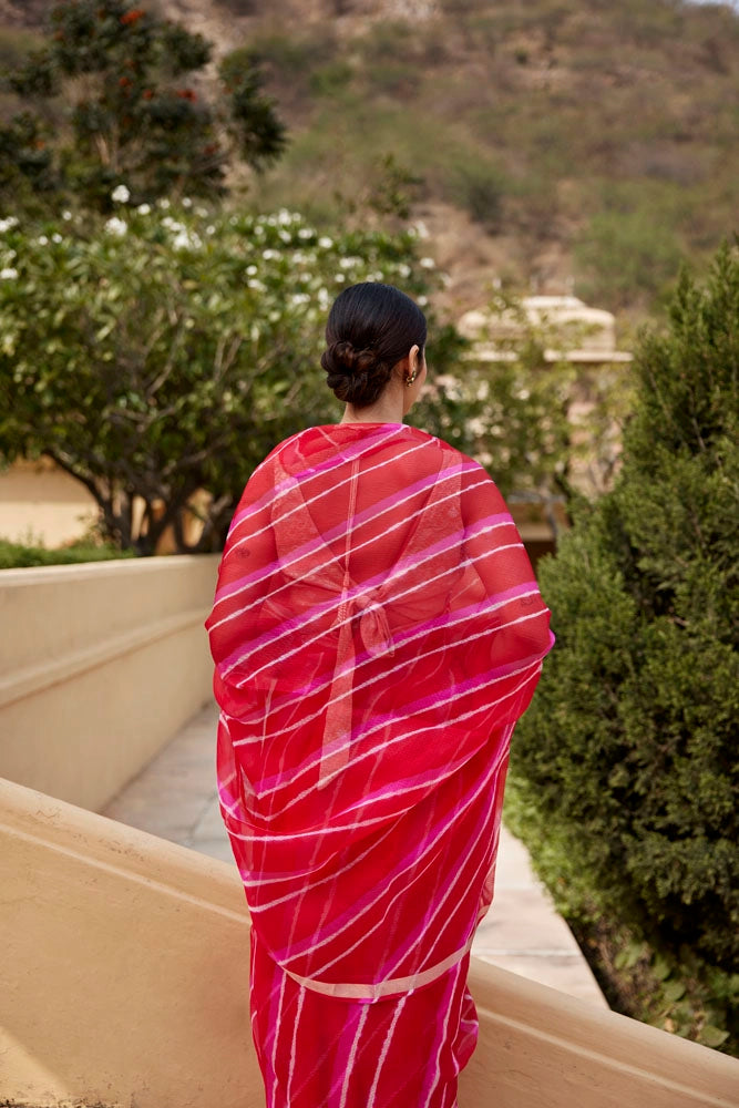 Geroo Jaipur brings an elegant hand-crafted red-pink leheriya saree to grace your festive season. The saree is crafted in pure kota silk using the effort-intensive technique of tie-dye. The mesmerizing leheriya patterns transform this saree into an artistic treasure, giving timeless touch and making it a wardrobe must-have. The saree is adorned with a golden one-inch zari border and paired with a matching unstitched blouse which adds a lot of festive glam to the saree.