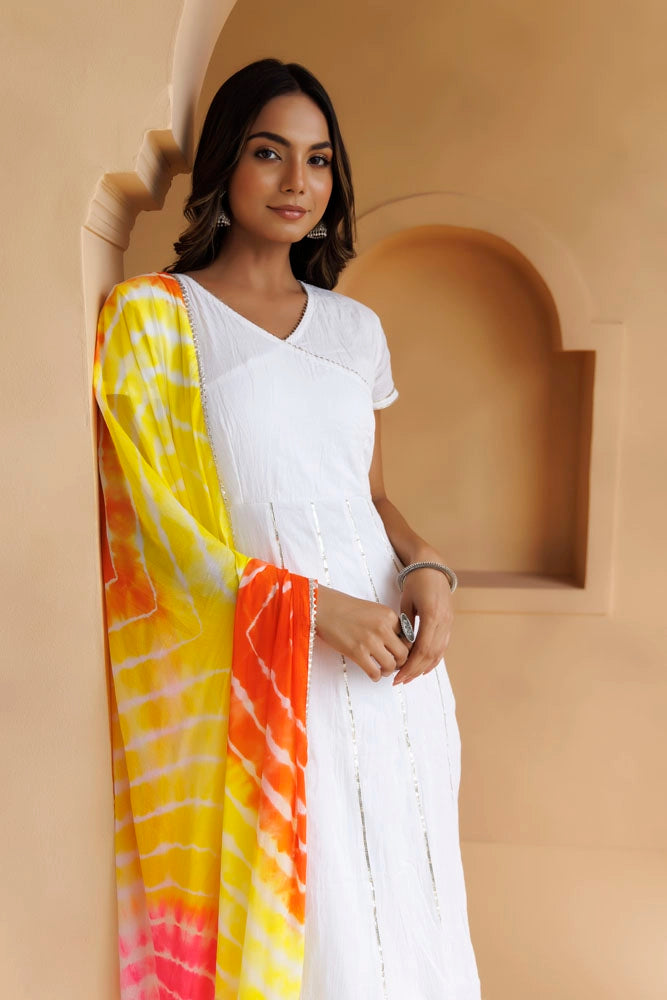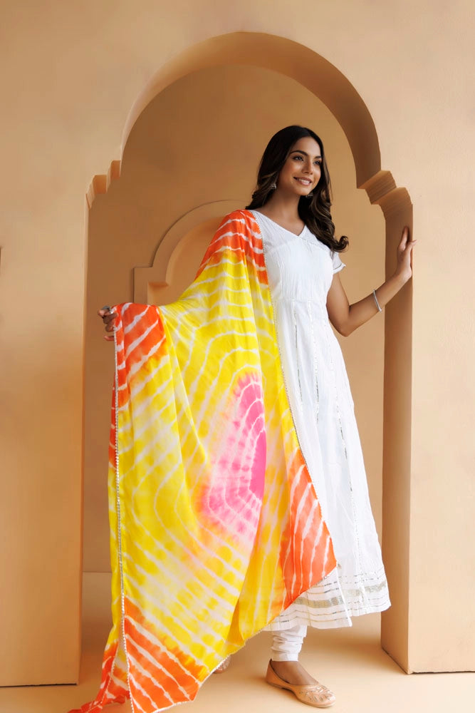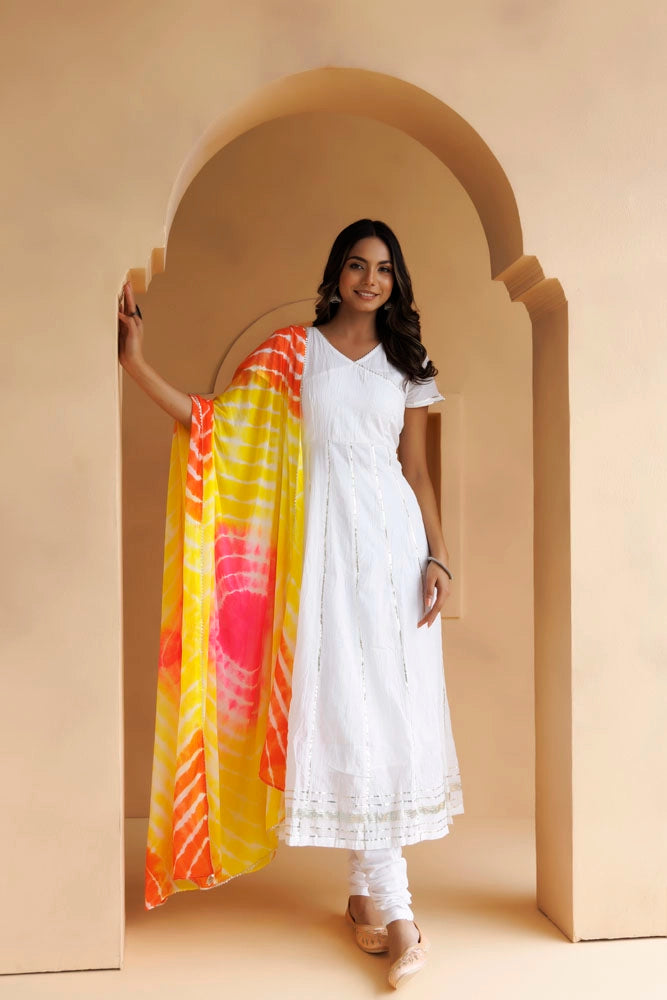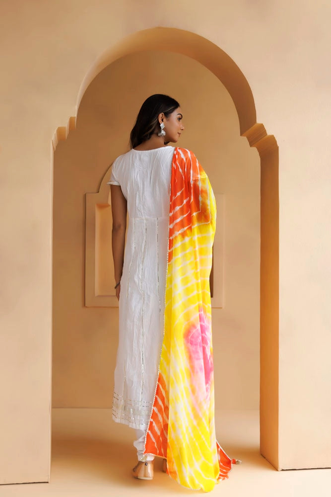 White Handcrafted Cotton Kurta Set With Leheriya Dupatta