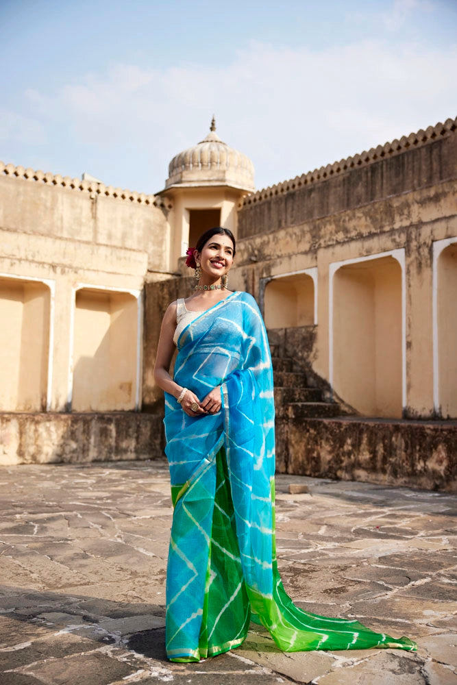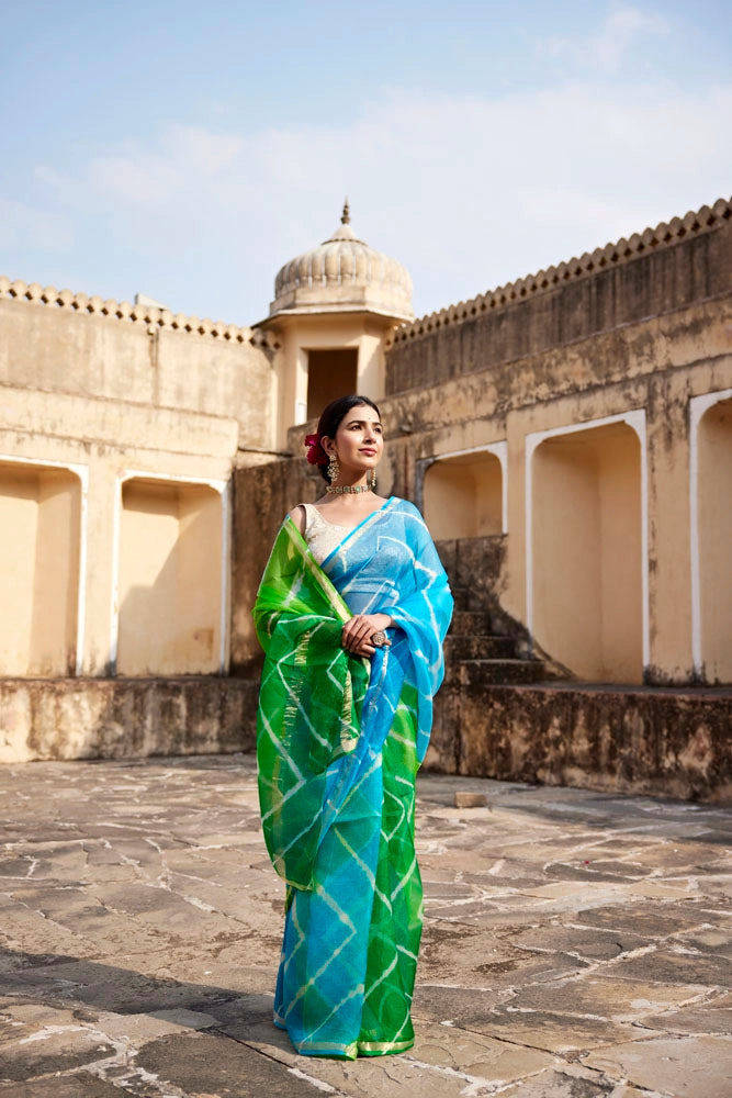 Turquoise Blue- Green Pure Kota Silk Hand Dyed Leheriya Saree