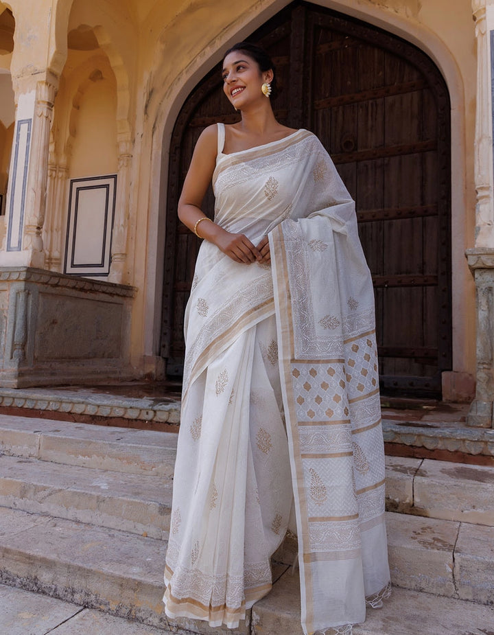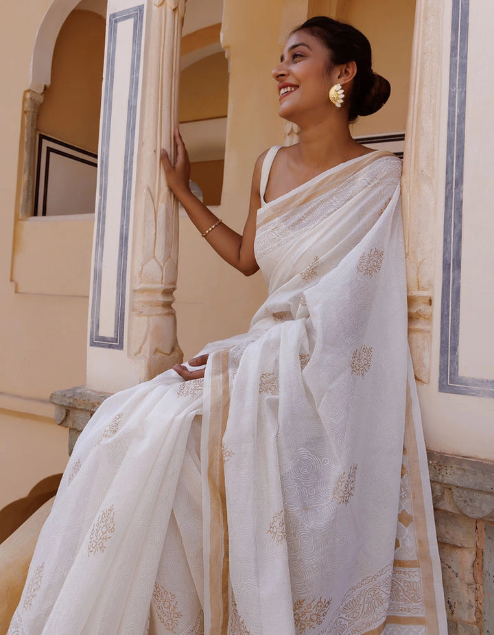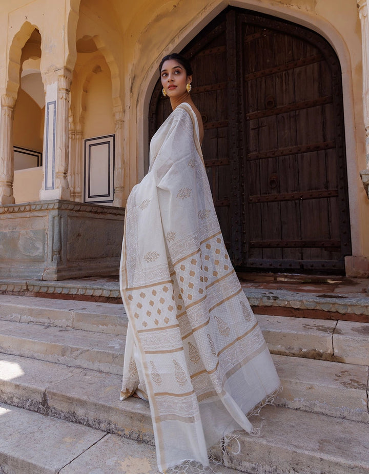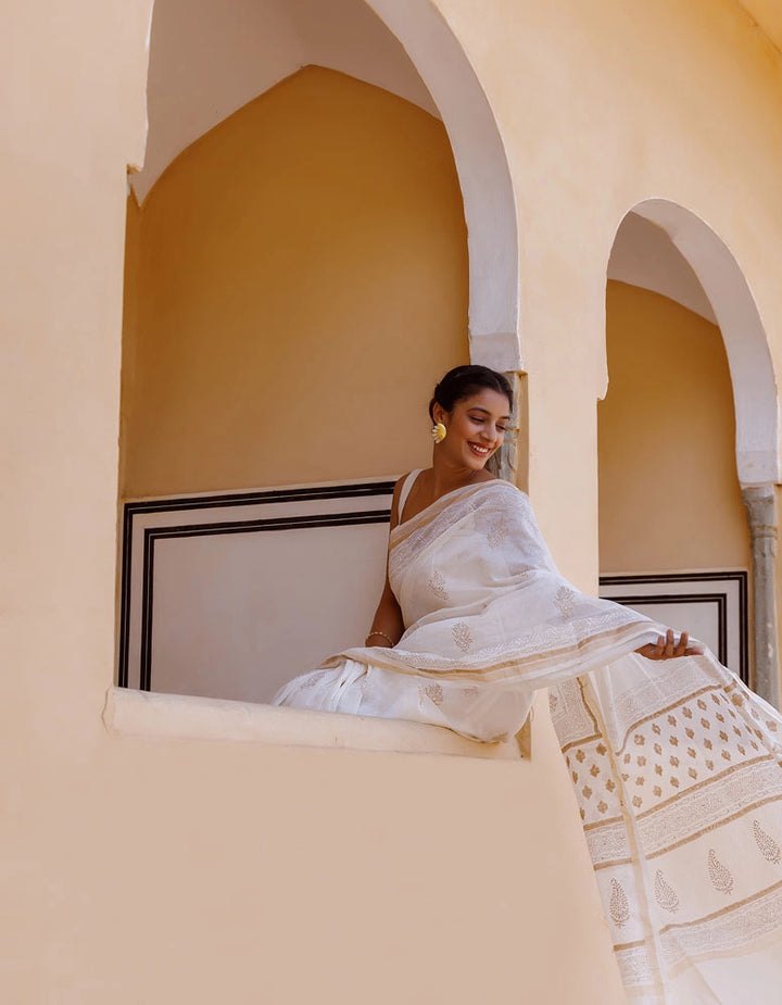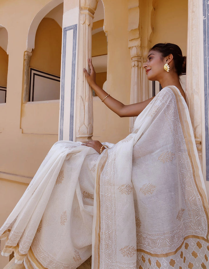 Geroo Jaipur features a saree that spells elegance and beauty that is sure to win your heart. The saree is crafted in pure chanderi with the effort-intensive technique of hand-block printing and hand-dyed in a shade of white. It is further embellished with khadi jaal and gold print with zari border which gives it a very rich look.