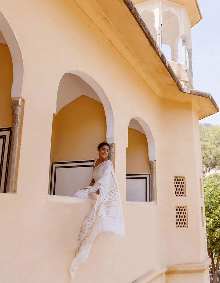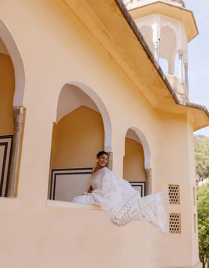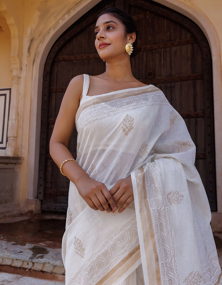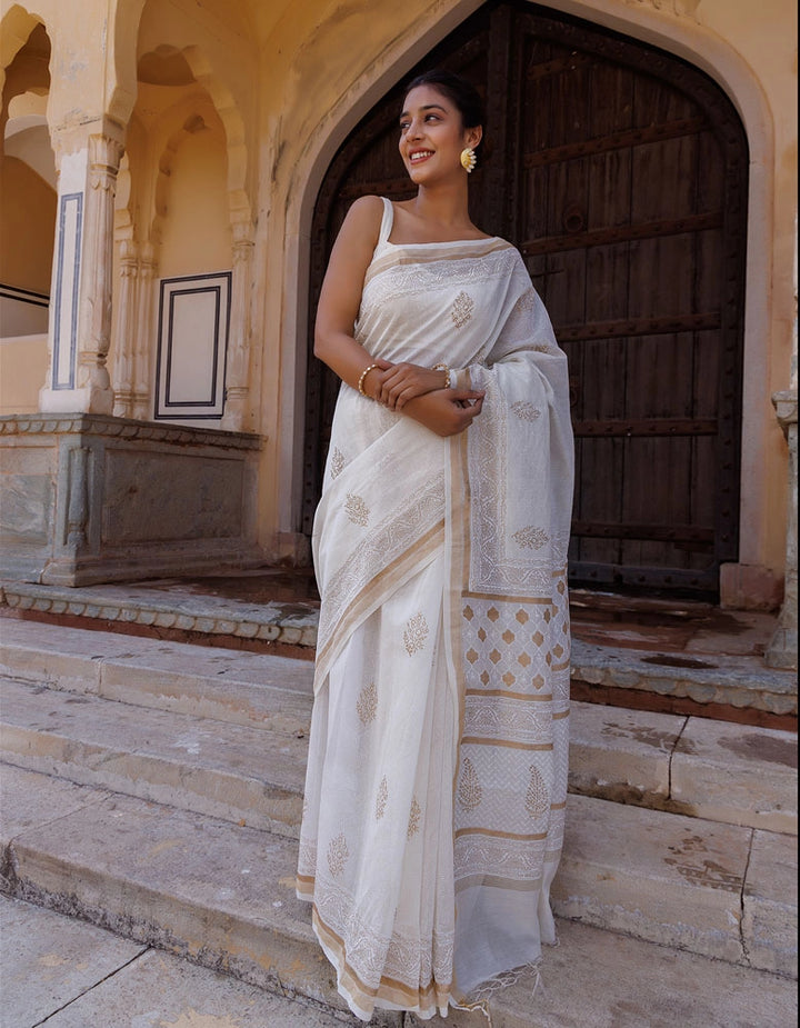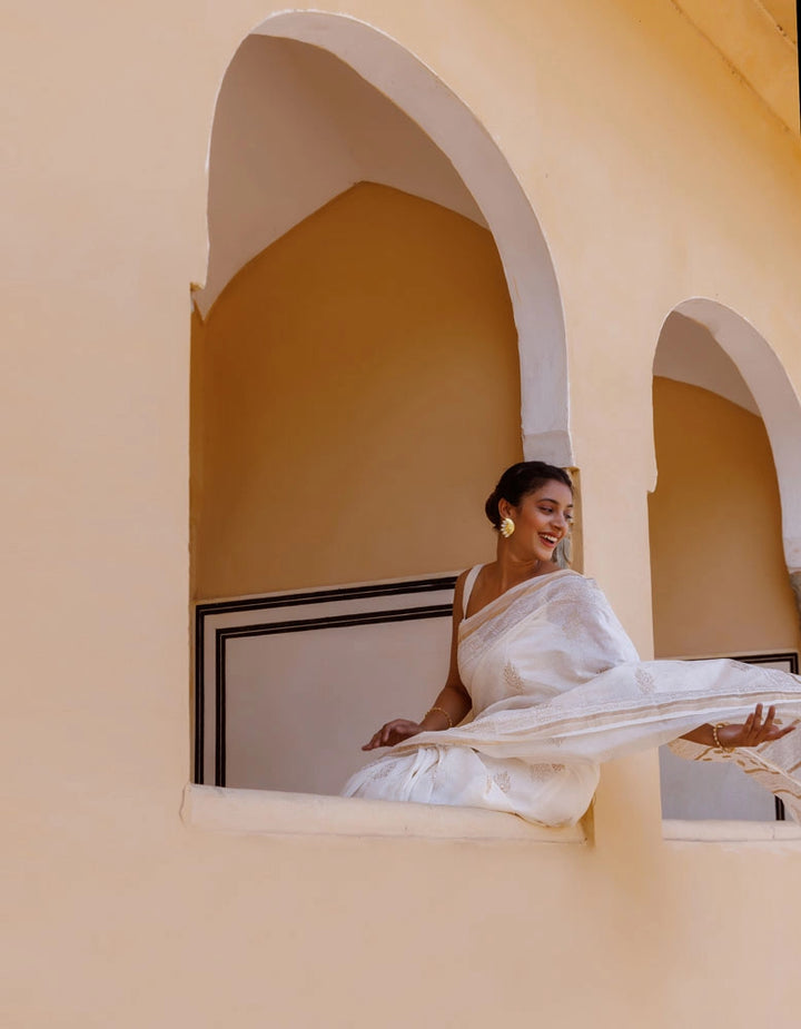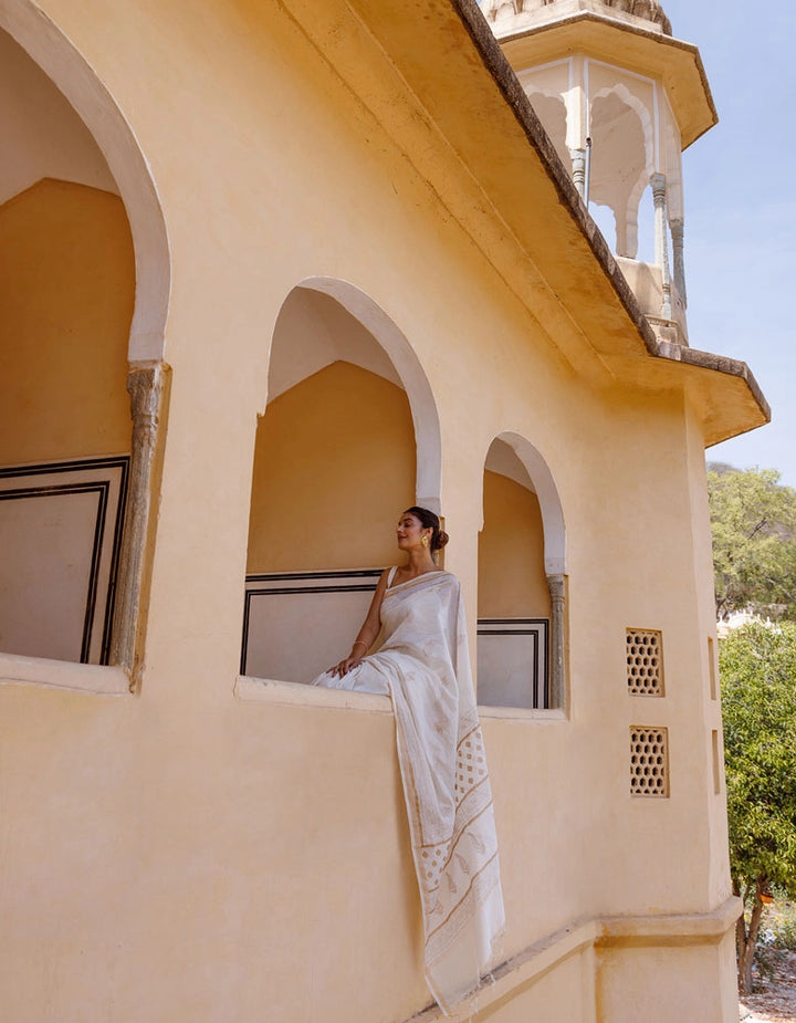 Geroo Jaipur features a saree that spells elegance and beauty that is sure to win your heart. The saree is crafted in pure chanderi with the effort-intensive technique of hand-block printing and hand-dyed in a shade of white. It is further embellished with khadi jaal and gold print with zari border which gives it a very rich look.