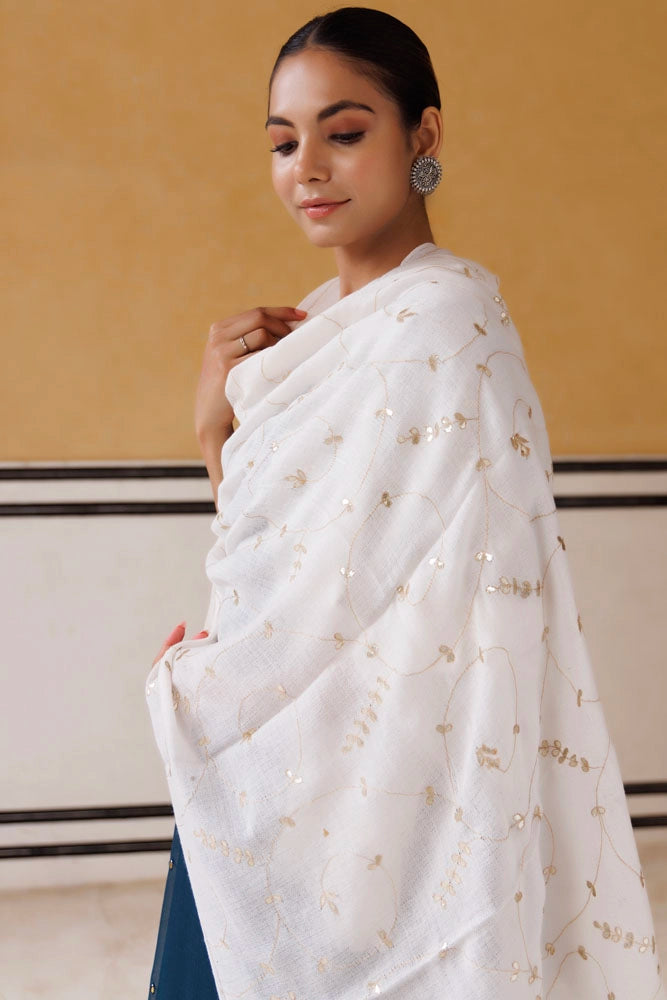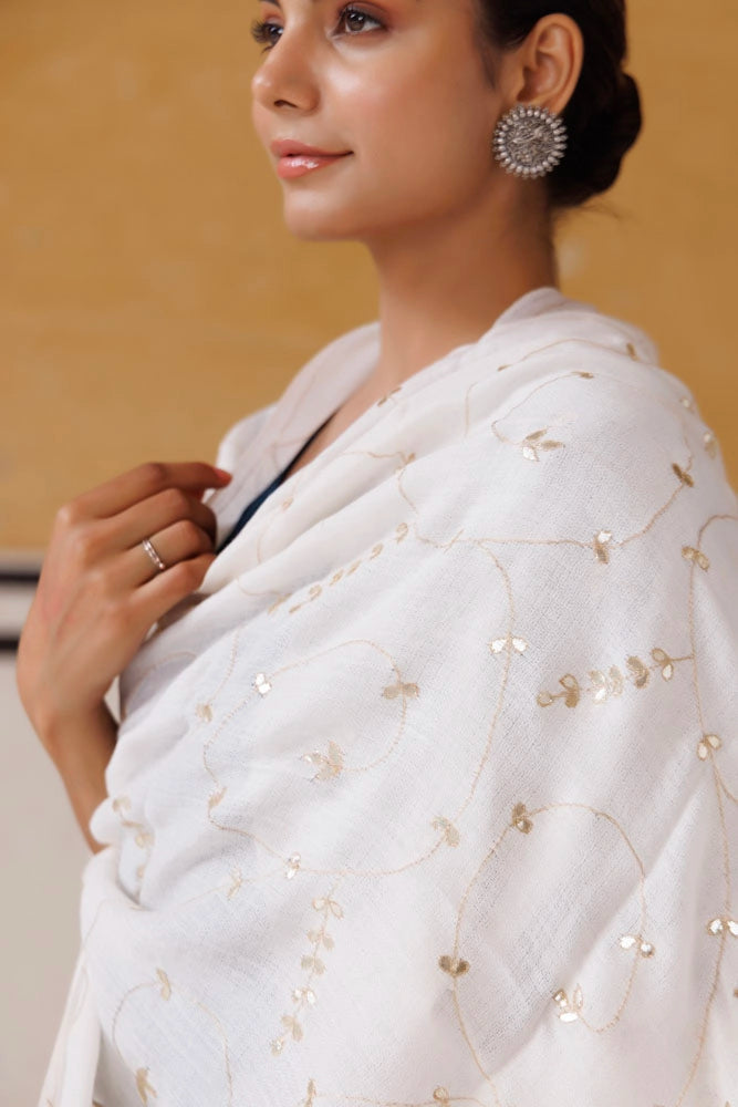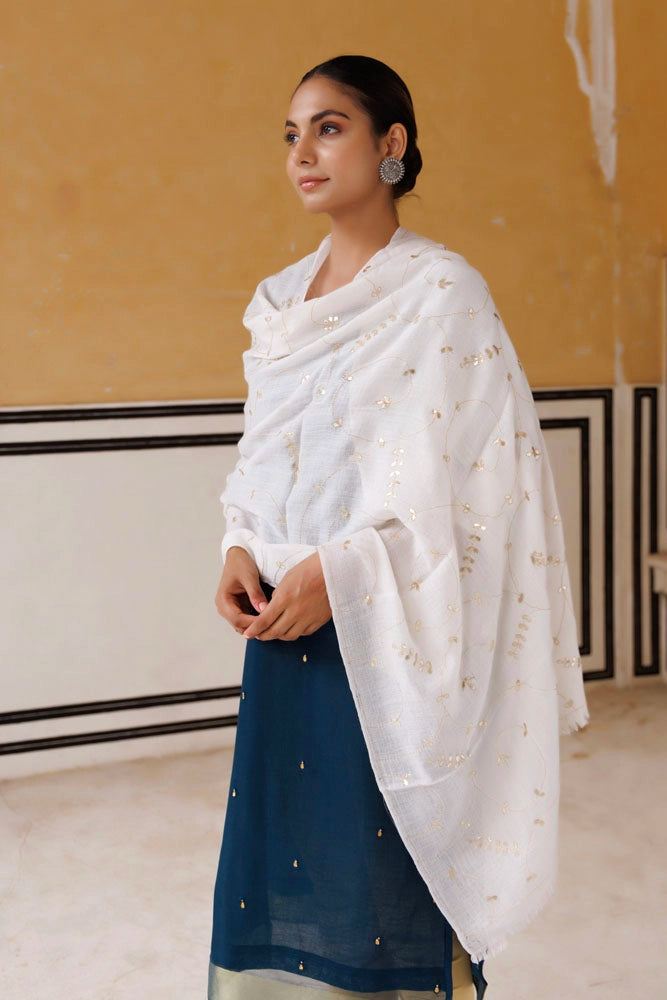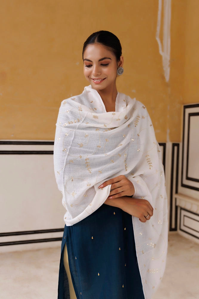 Wrap yourself in luxury with this hand-embroidered gota patti woolen shawl. It is intricately hand-crafted by skilled artists with fine embroidery of gota paati jaal. The soft texture and warmth of the shawl make it perfect for keeping you cozy and stylish.
