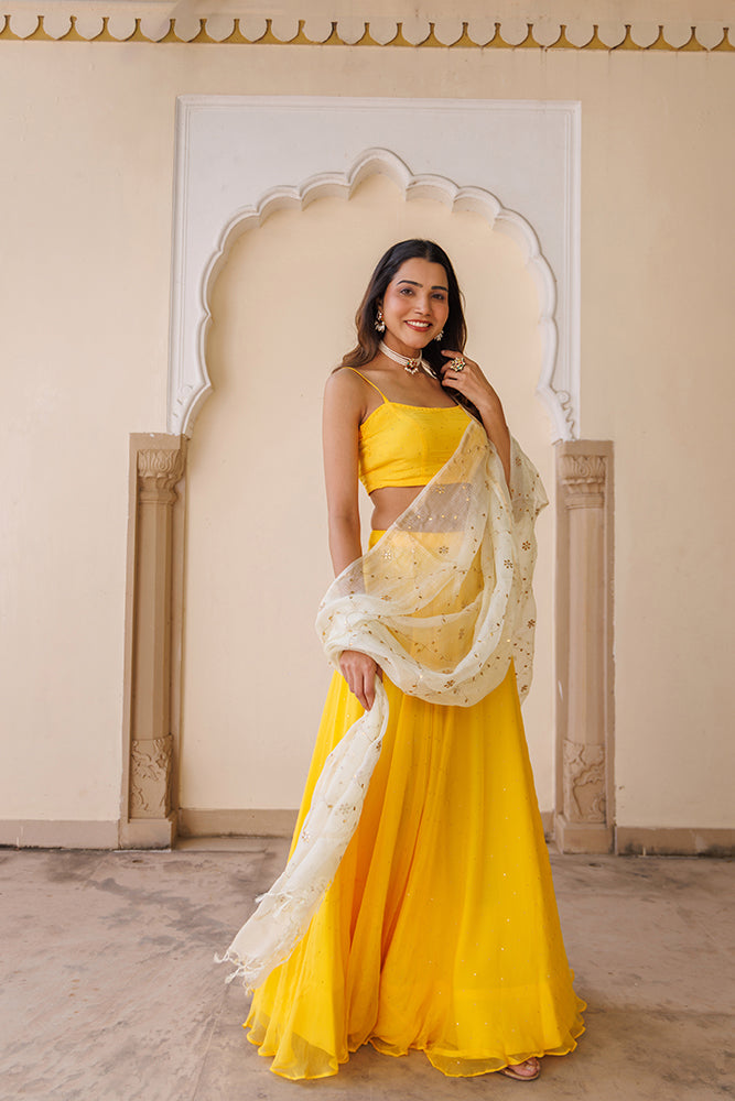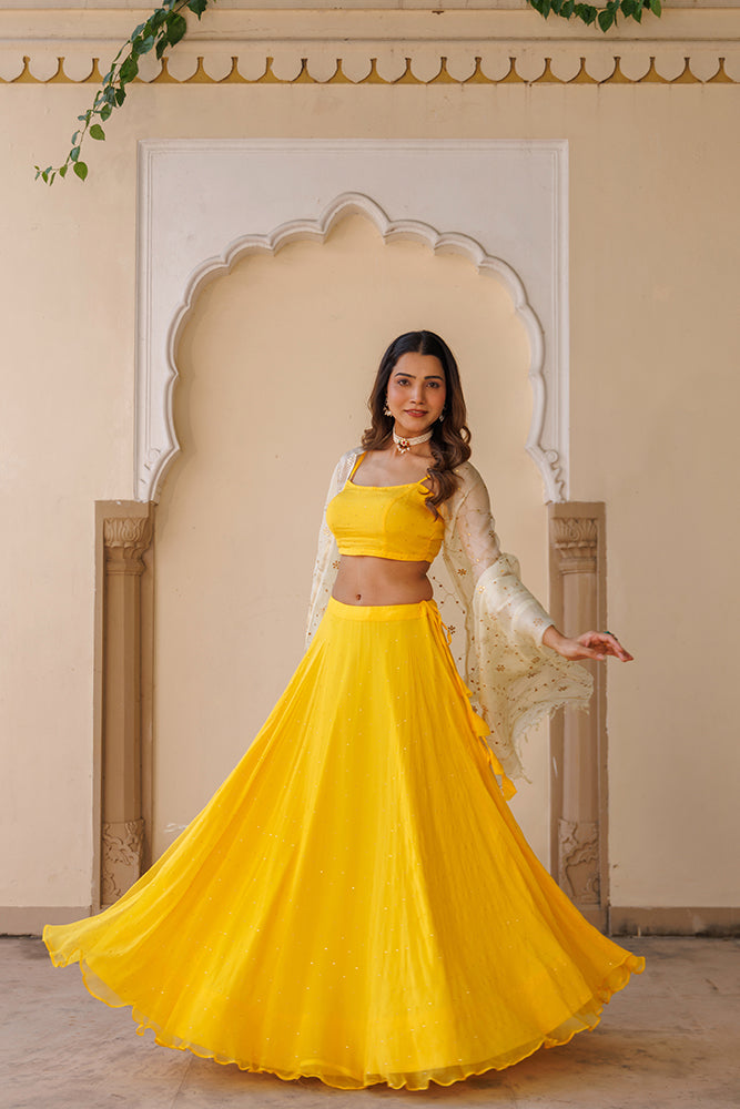 Yellow Chiffon Lehenga With Mukaish Work And Kota Silk Dupatta